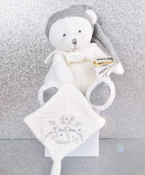 Ursulețul de pluș adorabil va deveni primul prieten al bebelușului tău. Combină o păturică de alint și un suport practic pentru suzetă, astfel încât tot ce e important este mereu la îndemână. Material premium, extrem de fin, nuanțe gri liniștitoare și execuție sigură conform normelor europene CE îl fac cadoul ideal încă de la naștere.