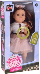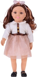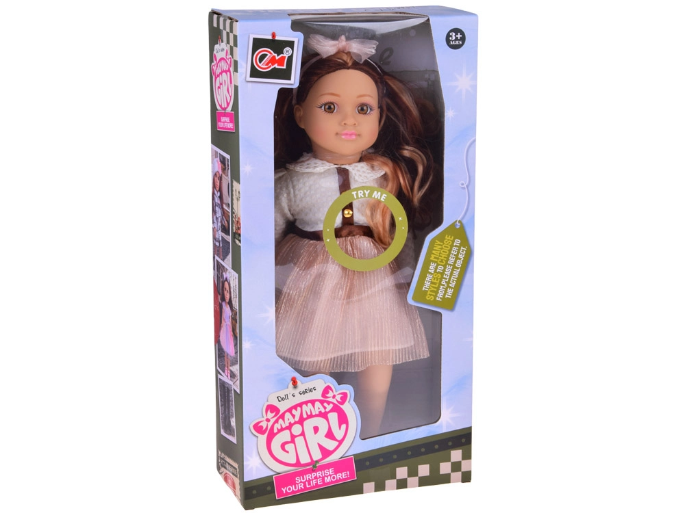 Păpușa fermecătoare MAY MAY GIRL se remarcă prin combinația detaliilor realiste și a execuției de calitate. Tricoul alb texturat cu nasturi aurii, fusta roz sclipitoare cu curea și bentița cu fundiță formează un set vestimentar elegant care stimulează imaginația și schimbările de ținute stilate.