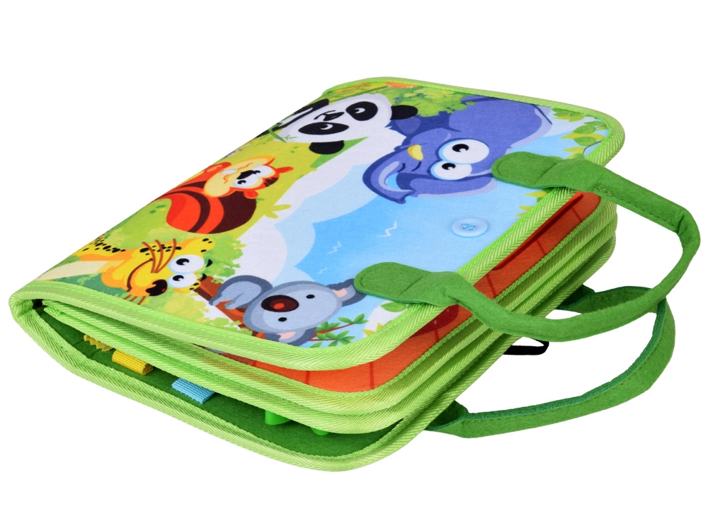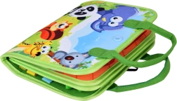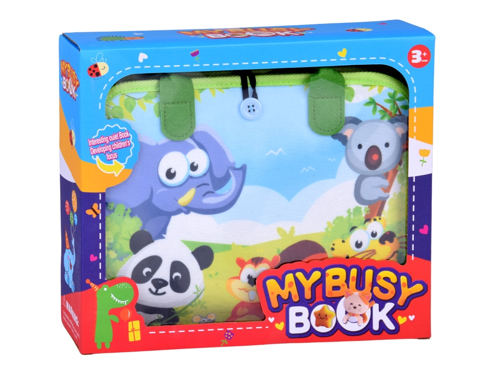 Conținutul include scenete pentru îmbrăcare (închidere, deschidere, legare), cameră pentru copii cu dulap pentru hăinuțe, bucătărie cu alimente, grădină cu sortarea fructelor și legumelor pe arici și o pagină pentru exersarea degetelor. Materialele moi și elementele sigure asigură o distracție liniștită acasă și în călătorii.
