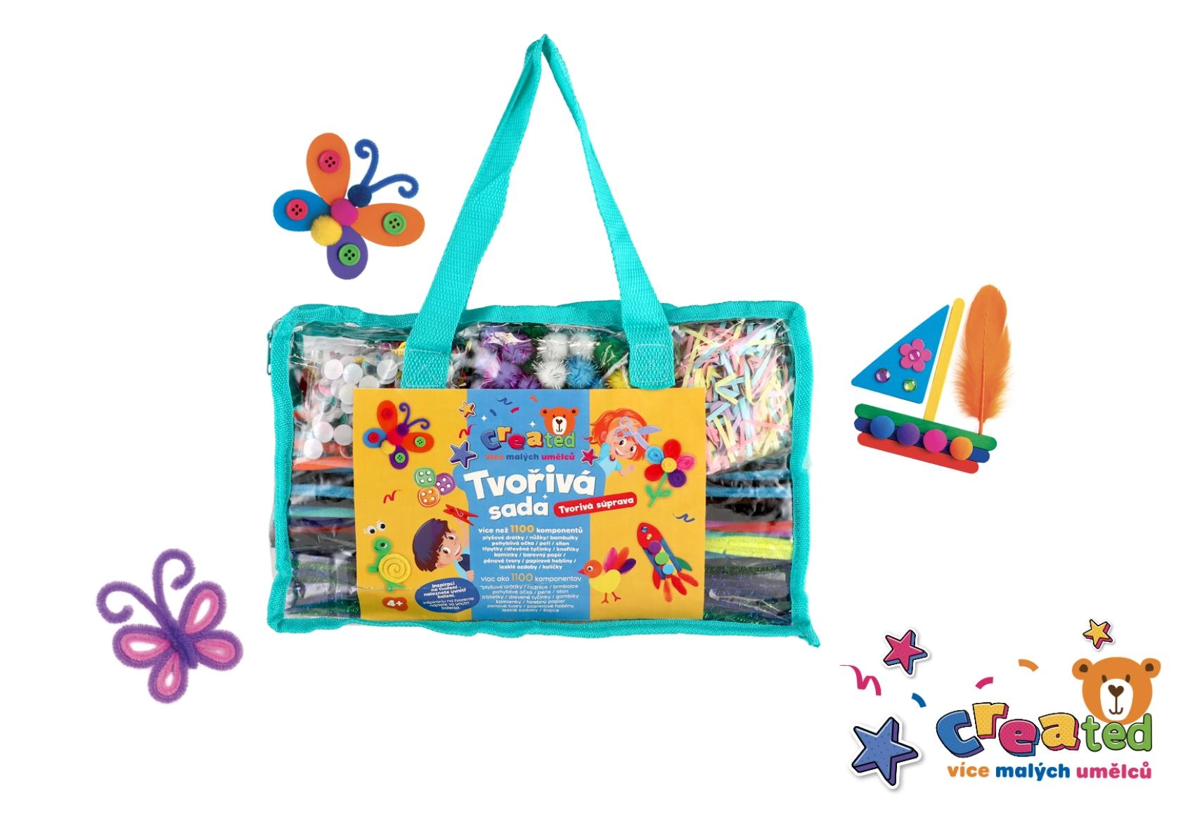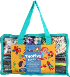 Acest set creativ variat stimulează imaginația copiilor și motricitatea fină. Datorită combinației bogate de componente – precum sârmulițe pufoase, pom‑pomuri, forme din spumă, mărgele, pene și autocolante – copiii pot realiza proiecte simple sau mai complexe după dispoziție.