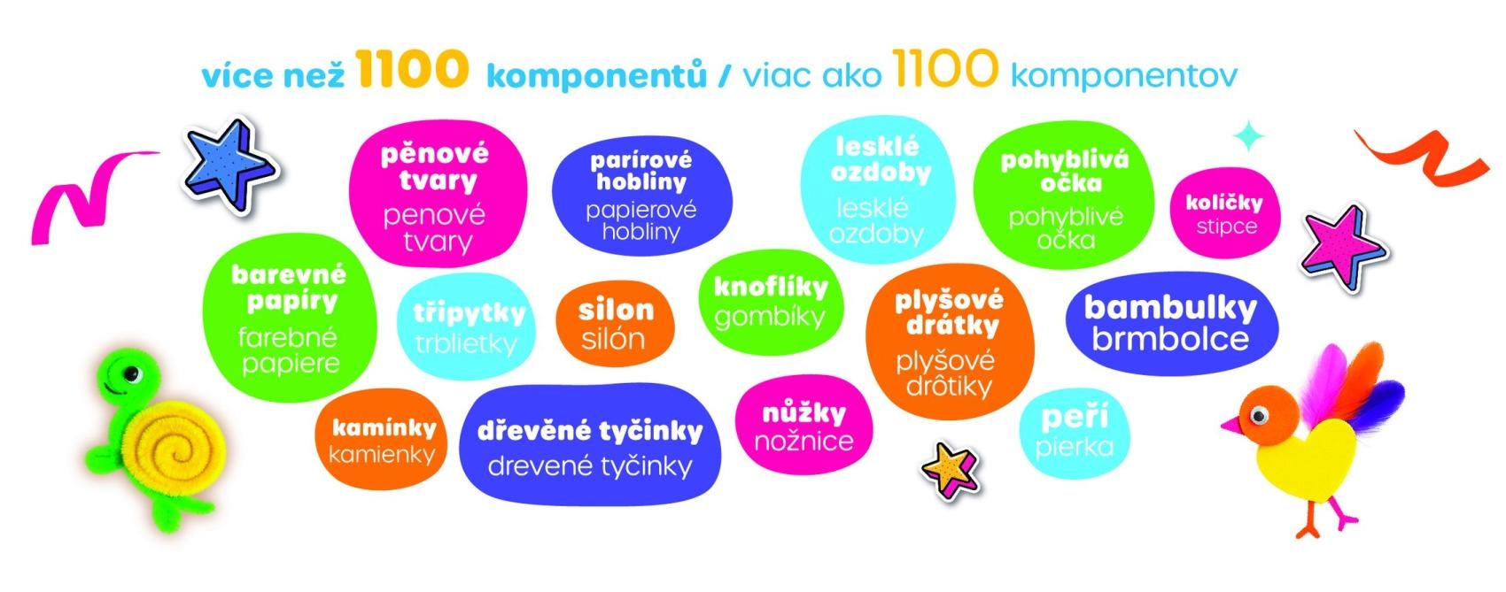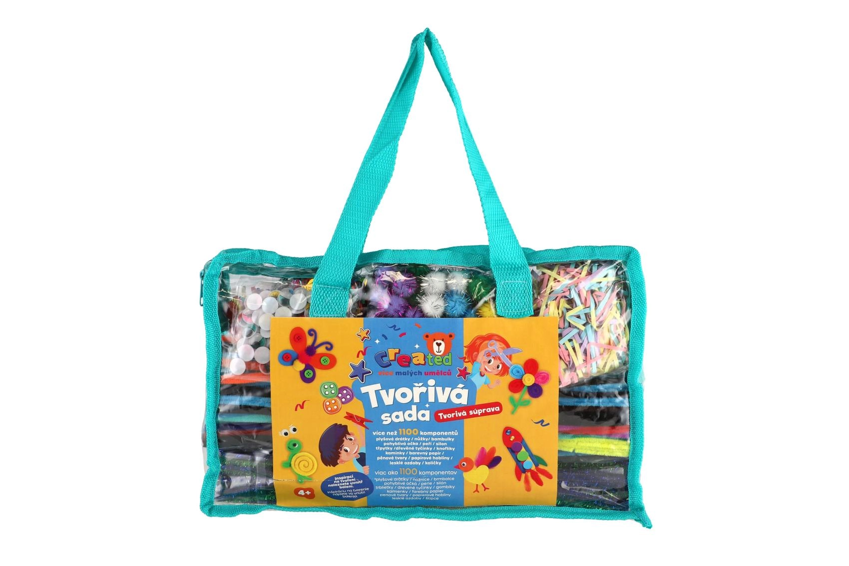 Mărgele, pom‑pomuri, sârmulițe pufoase, forme din spumă și pene le permit copiilor să creeze desene, figurine, animăluțe și decorațiuni exact după propriile idei.
