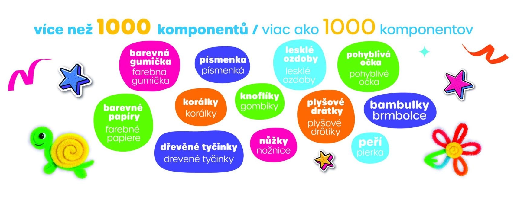 Acest set bogat dezvoltă imaginația copiilor, motricitatea fină și creativitatea. Datorită materialelor variate, copiii își pot crea propriile decorațiuni, animăluțe, flori sau mici ornamente – acasă, la grădiniță sau în călătorii. Cutia practică păstrează toate piesele la un loc și grăbește strângerea.