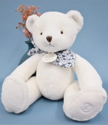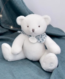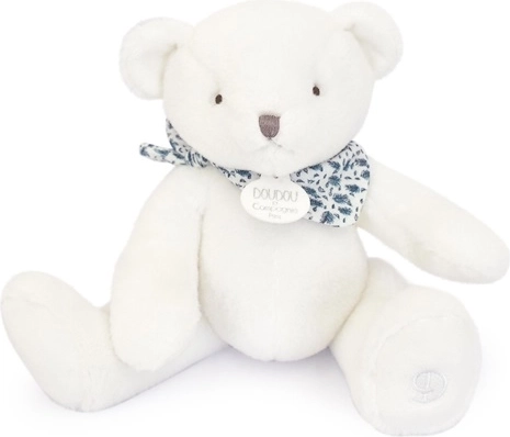 Adorabilul ursuleț de pluș alb cu eșarfă albastră de la DOUDOU este primul prieten ideal pentru bebeluși. Este realizat din material moale, premium, are detalii brodate sigure și este potrivit încă de la naștere. Excelent pentru liniștire, alint și un somn odihnitor, iar datorită culorilor blânde se potrivește în orice trusou pentru copii.