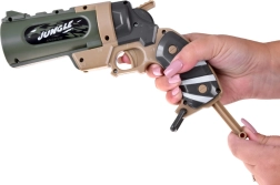 Setul JUNGLE este o alegere excelentă pentru jocuri de acțiune în aer liber sau în interior. Pistolul ușor și rezistent se ține confortabil în mâna copilului, proiectilele din spumă moale cu capăt de cauciuc asigură un joc mai sigur, iar țintele în formă de doze motivează antrenarea preciziei. Doar încarcă, țintește și doboară țintele.