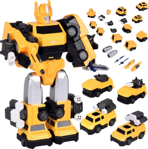 Acest transformer magnetic futurist impresionează prin combinația cromatică galben‑negru și construcția robustă. Datorită conectorilor magnetici puternici, copiii pot reconfigura rapid robotul și crea propriile scene eroice. Iluminarea LED în partea inferioară adaugă acțiunii o atmosferă realistă.