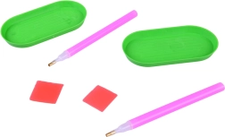 Două tăvițe cu caneluri, două stilouri aplicatoare și două ceruri asigură așezarea precisă și confortabilă a pietricelelor – ideal pentru copii și începători.