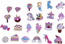 - 24 brelocuri din plastic de decorat cu pietricele, 12 lanțuri metalice, 12 cârlige/clipuri din plastic, 2 tăvițe pentru pietricele, 2 ceruri, 2 stilouri aplicatoare, >3000 pietricele