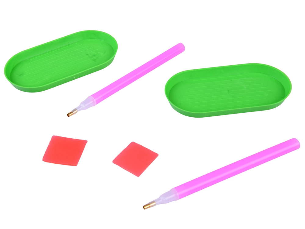 Două tăvițe, două stilouri de aplicare cu vârf metalic și pernuțe de ceară ușurează preluarea și așezarea precisă a pietricelelor – curat și fără dezordine.
