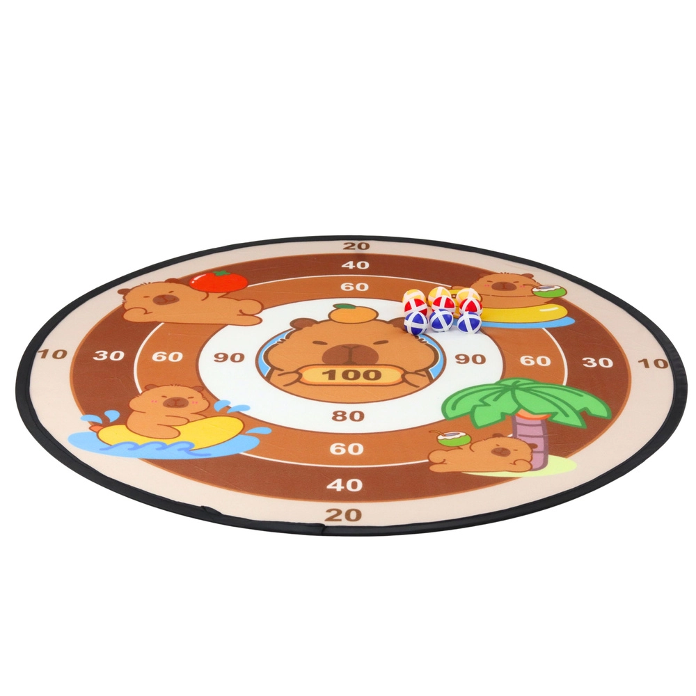 Joc de țintă amuzant cu motiv de capibare pentru 2 jucători, care dezvoltă precizia, reflexele și coordonarea mână-ochi. Panou de țintă mare, 73,5 cm, 2 pistoale și 9 mingi sigure cu scai pentru distracție dinamică, dar sigură, acasă sau în grădină. Fără baterii, agățare ușoară cu cârlig cu ventuză.