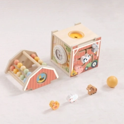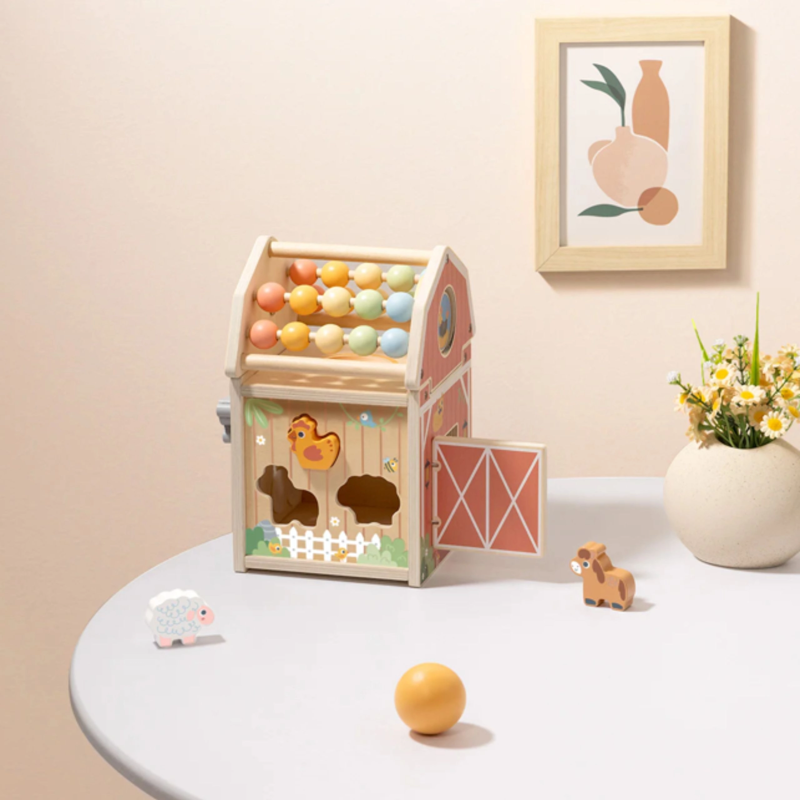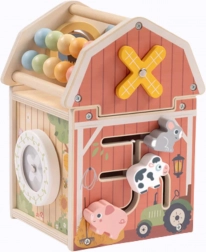 Acest grajd de activități din lemn este conceput pentru a-i ajuta pe copii să-și dezvolte abilitățile într-un mod distractiv. Pe acoperiș găsești un abac colorat pentru primele noțiuni de numărat, pe laterale un sortator de forme cu decupaje în forma siluetelor de animale și un labirint motric cu animăluțe. Ușile funcționale și acoperișul detașabil permit accesul facil la interiorul șurii și extind posibilitățile de joc.