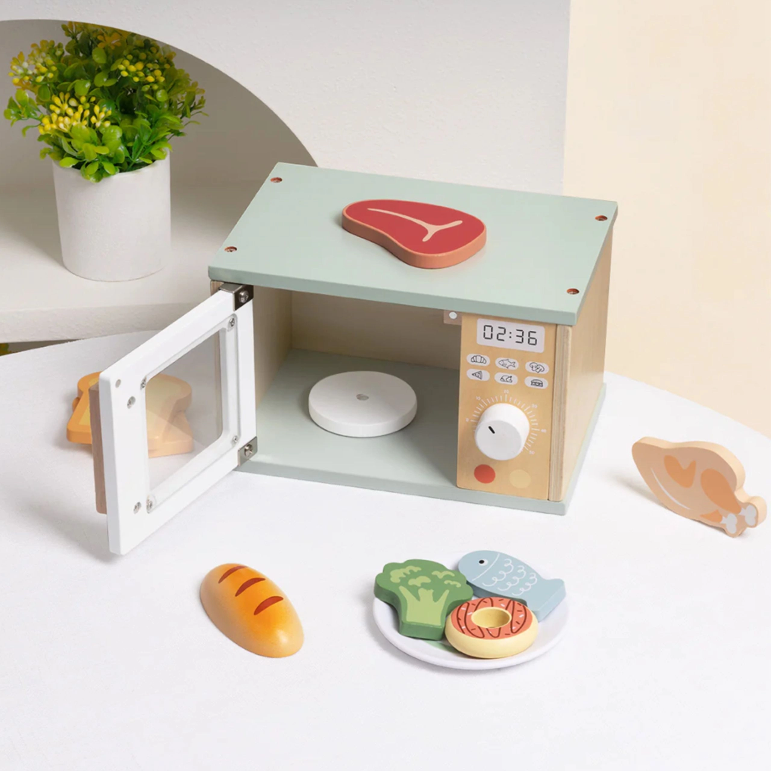 Cuptorul cu microunde din lemn, stilat, de la TOOKY TOY oferă copiilor de la 3 ani un joc realist de gătit. Include un set bogat de accesorii din alimente de lemn, un buton rotativ și o ușiță care se deschide pentru jocuri de rol autentice. Execuția din lemn de calitate, marginile netede și construcția rezistentă asigură distracție sigură și de durată.