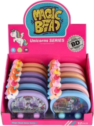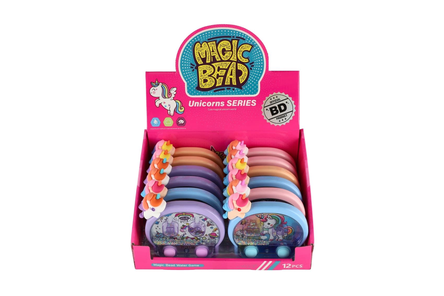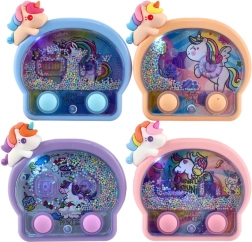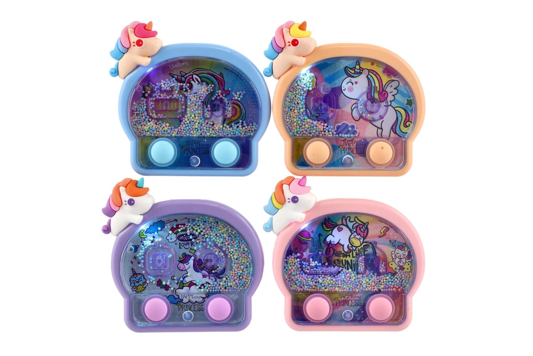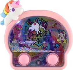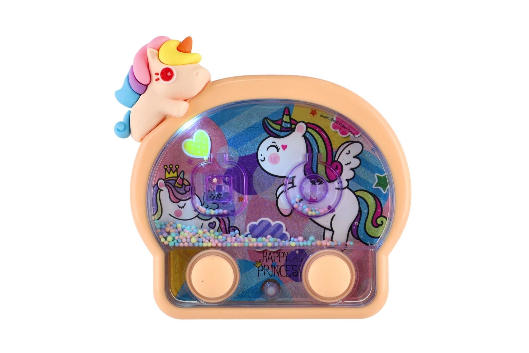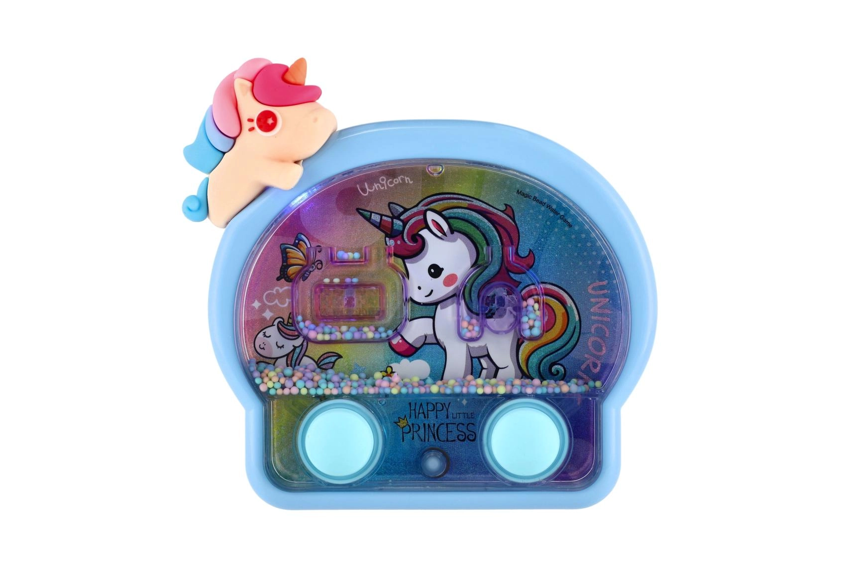 Joc magic de buzunar cu apă, cu temă de unicorni, care distrează copiii oricând și oriunde. Prin apăsarea butoanelor pui apa în mișcare și așezi inelele pe țepi. Jocul dezvoltă motricitatea fină, concentrarea și răbdarea, iar datorită efectelor luminoase arată și mai fermecător.