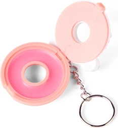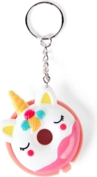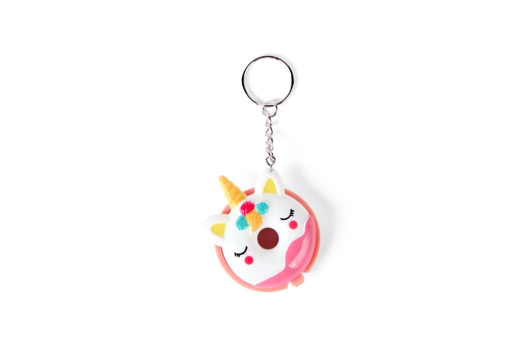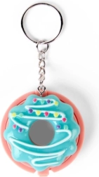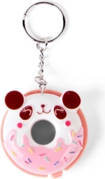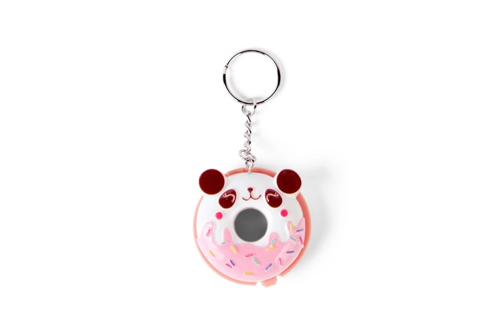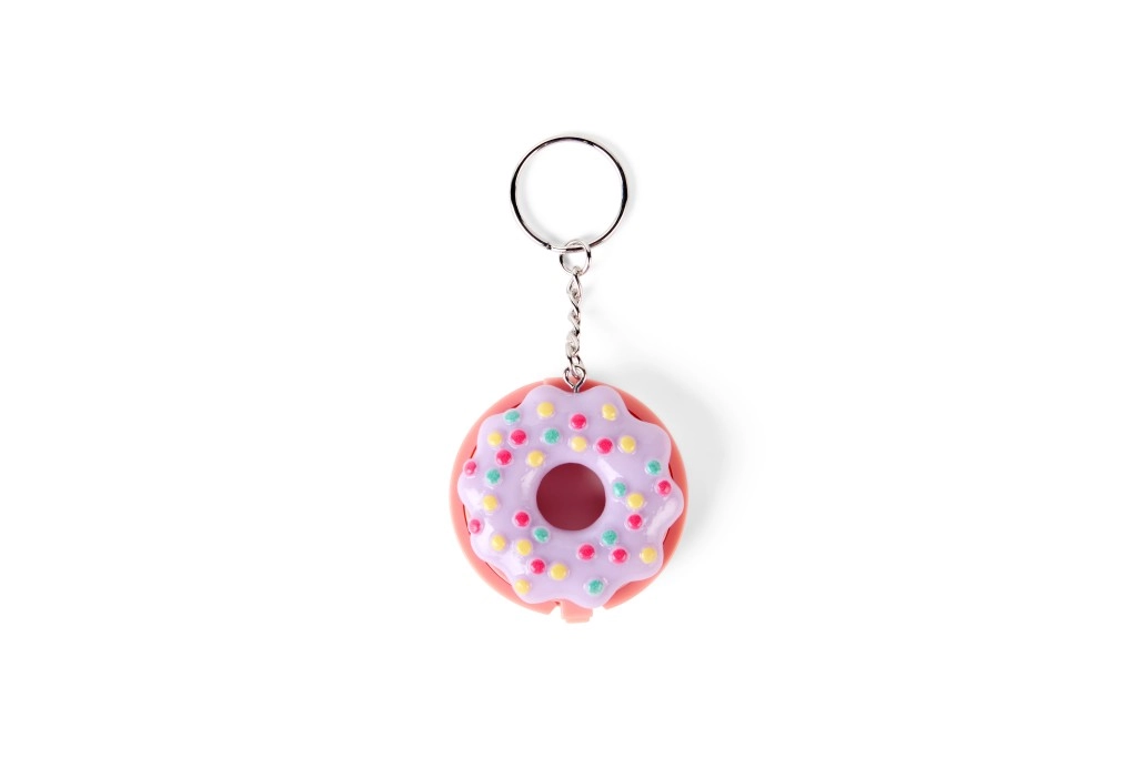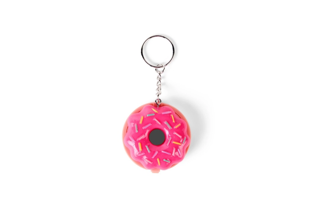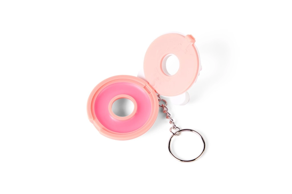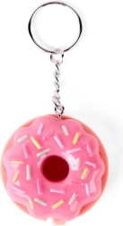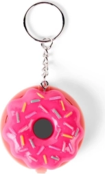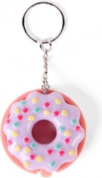 Ambalaj compact în formă de donut roz cu „sprinkles” colorate și breloc metalic pentru prindere ușoară de rucsac sau chei.