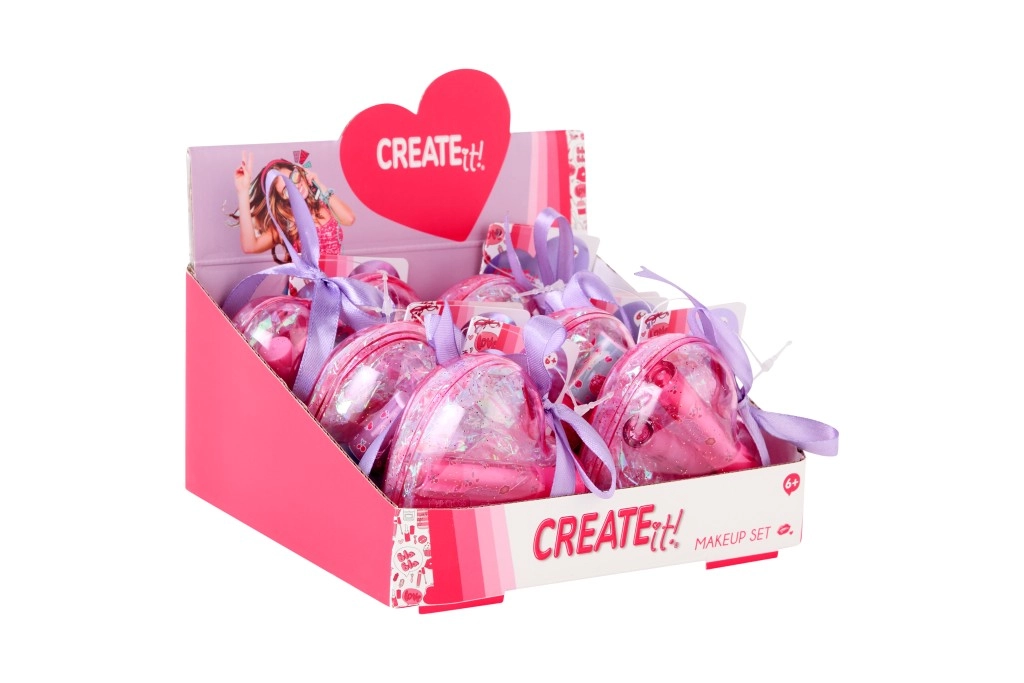 Descoperă farmecul machiajului pentru copii cu setul CREATE IT! în etuiul adorabil în formă de inimă. Carcasa roz transparentă cu sclipici și panglică practică oferă depozitare sigură pentru cosmetice și încape perfect în rucsac sau poșetuță. Fiecare set este conceput pentru bucuria creativității și ușurința utilizării.