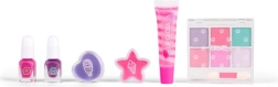 - 2× lac de unghii, cretă pentru păr, pensulă mare, balsam de buze, ruj, pensulă mică dublă, paletă cu 6 farduri de pleoape sclipitoare