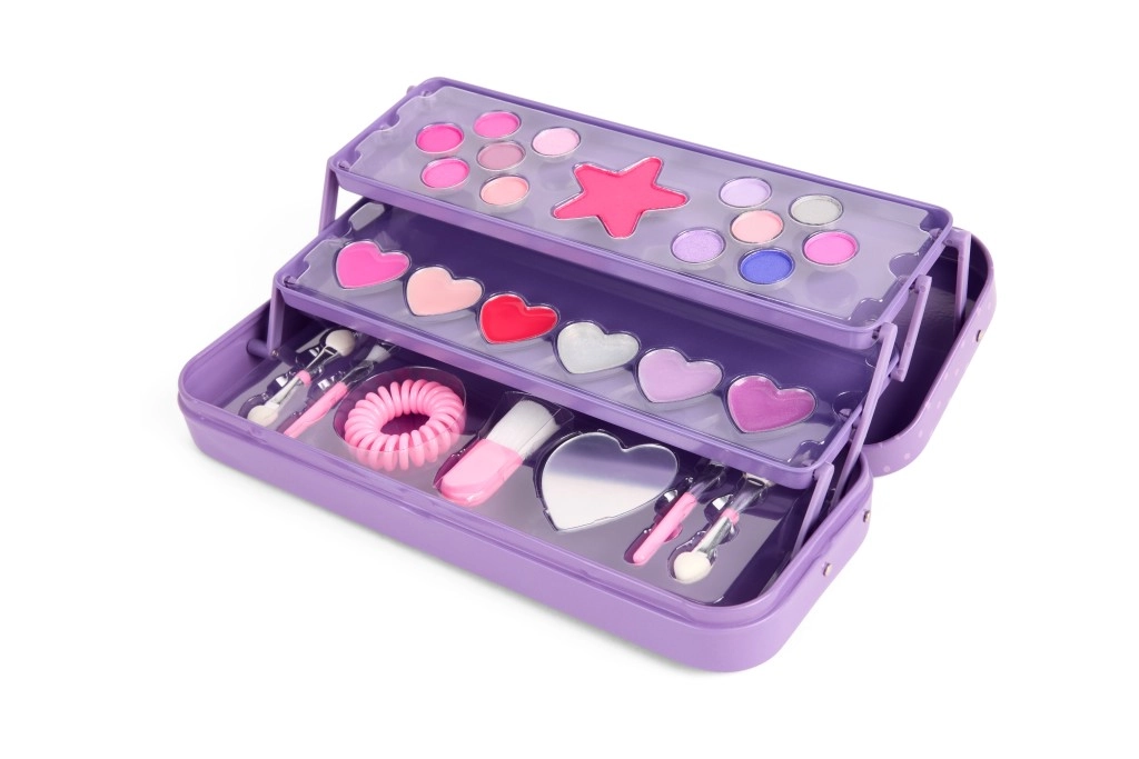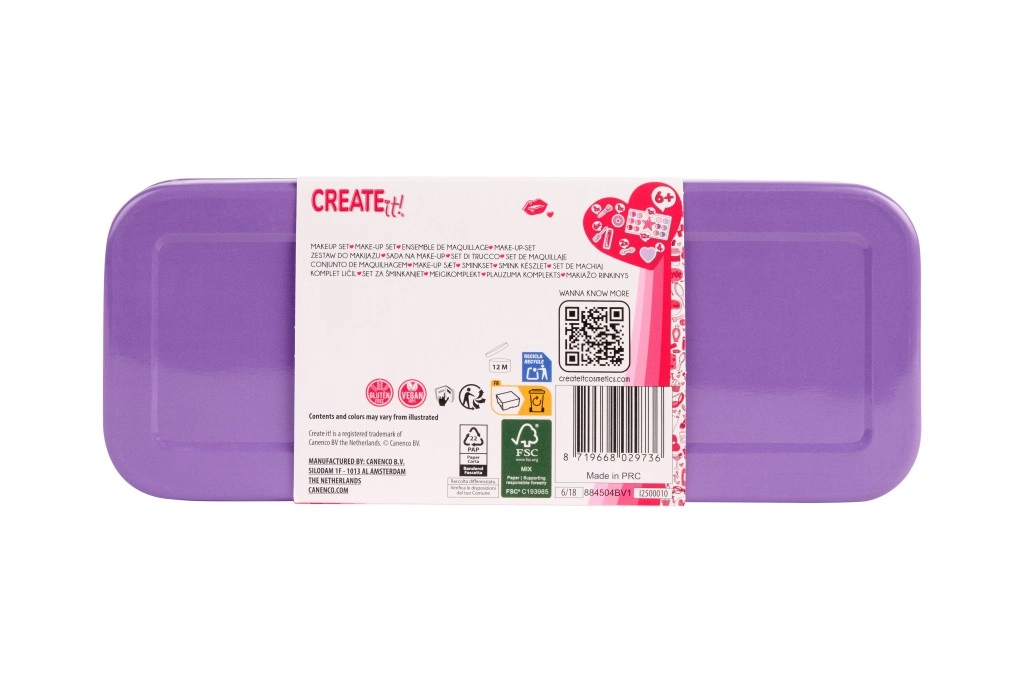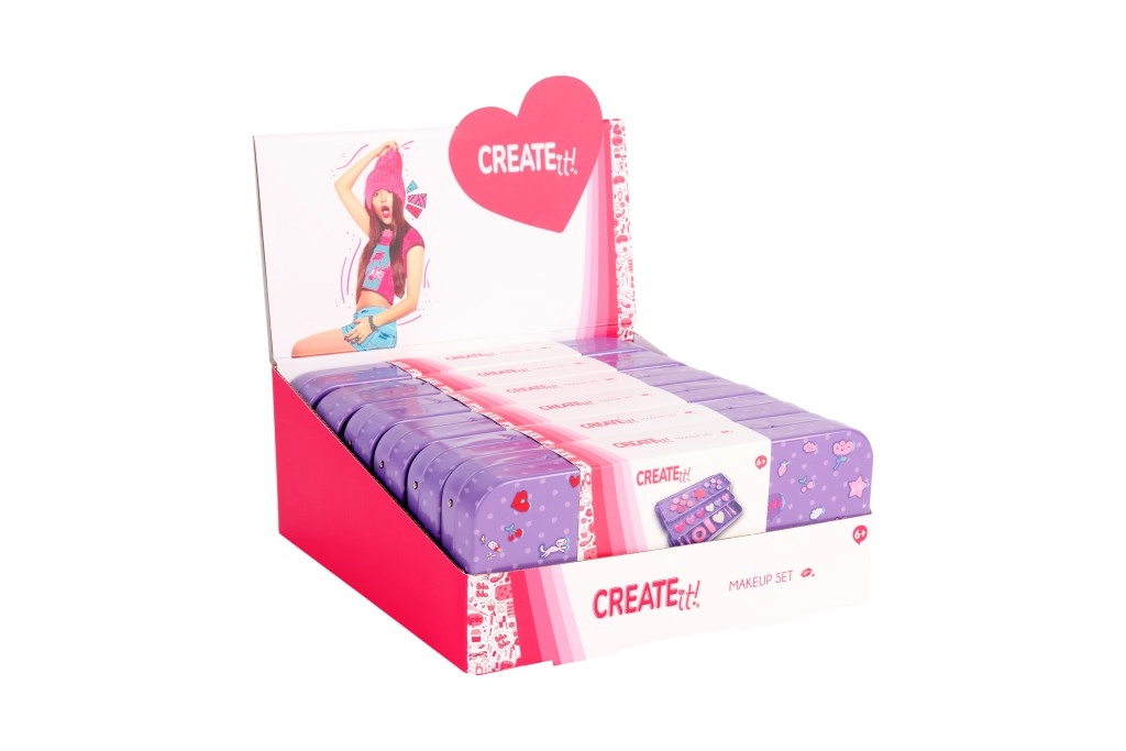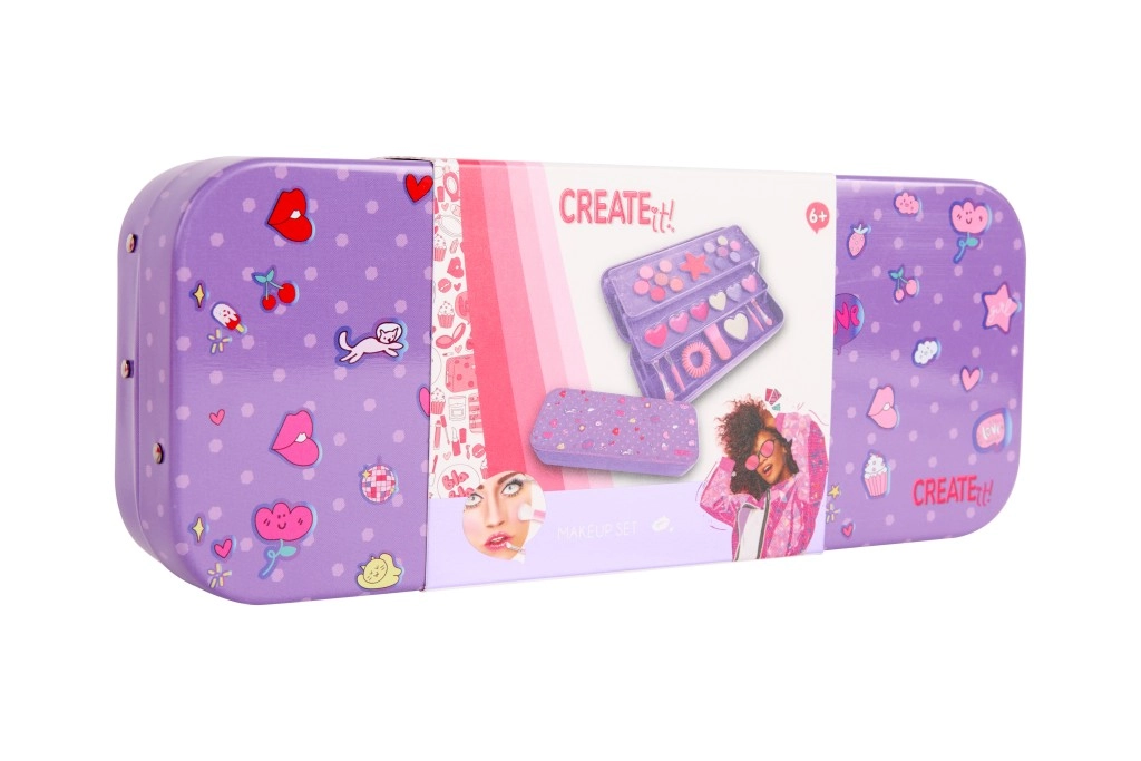 Această casetă extensibilă CREATE IT! oferă tot ce au nevoie copiii pentru înfrumusețare sigură și plină de bucurie. Cele trei niveluri ascund 10 farduri de ochi, un blush, 6 glossuri de buze, pensule, o oglindă drăgălașă în formă de inimă și un elastic practic de păr. Datorită carcasei metalice solide, setul este ideal pentru călătorii și rezistă deschiderilor frecvente.