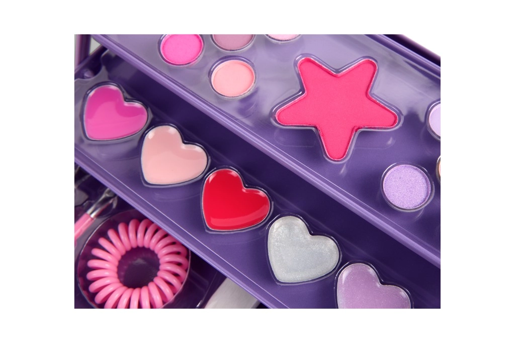 10 farduri de ochi, un blush, 6 glossuri de buze, 3 tipuri de pensule, oglindă în formă de inimă și un elastic de păr pentru o experiență completă de machiaj.