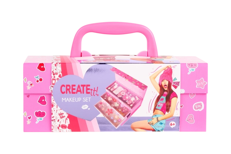 Descoperiți farmecul machiajului creativ cu trusa cosmetică cu trei niveluri CREATE IT!, destinată copiilor de aproximativ 6+ ani. Trusa compactă, cu mâner și închidere magnetică sigură, ascunde compartimente organizate clar, care susțin autonomia, ordinea și bucuria de a se machia.