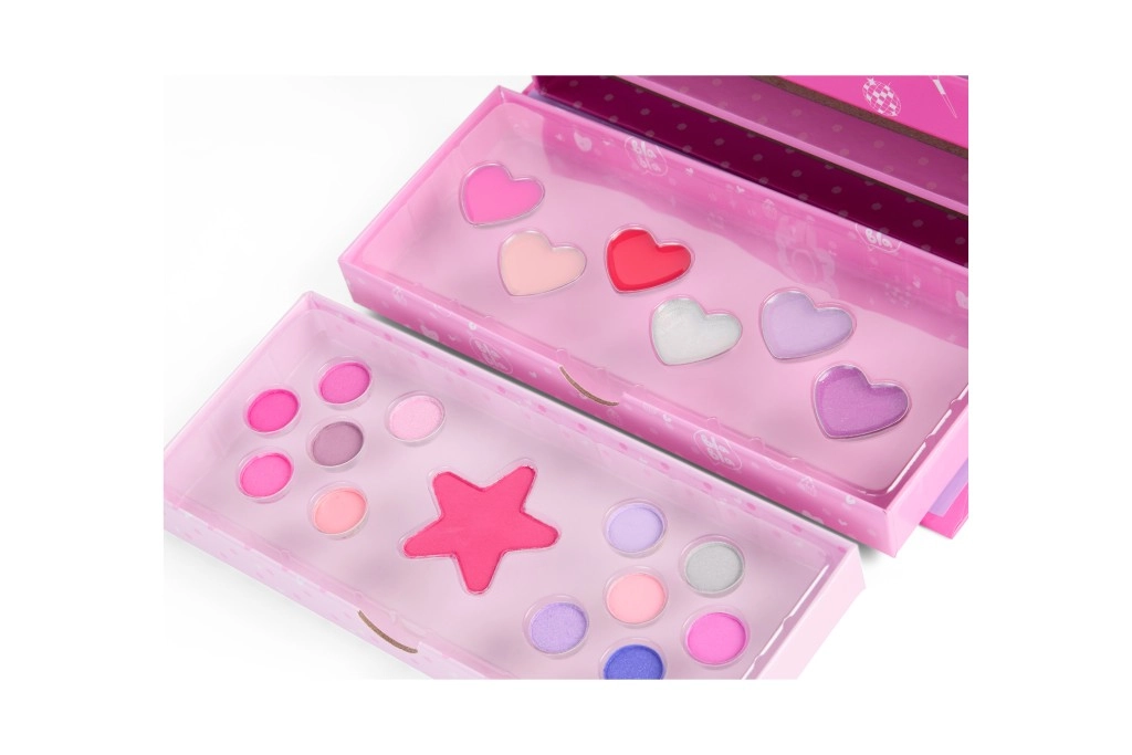 Primul nivel: 2× ojă, pilă, 2× aplicator, stickere pentru unghii și fard de obraz. Al doilea nivel: glossuri de buze. Al treilea nivel: farduri de pleoape și farduri de obraz.