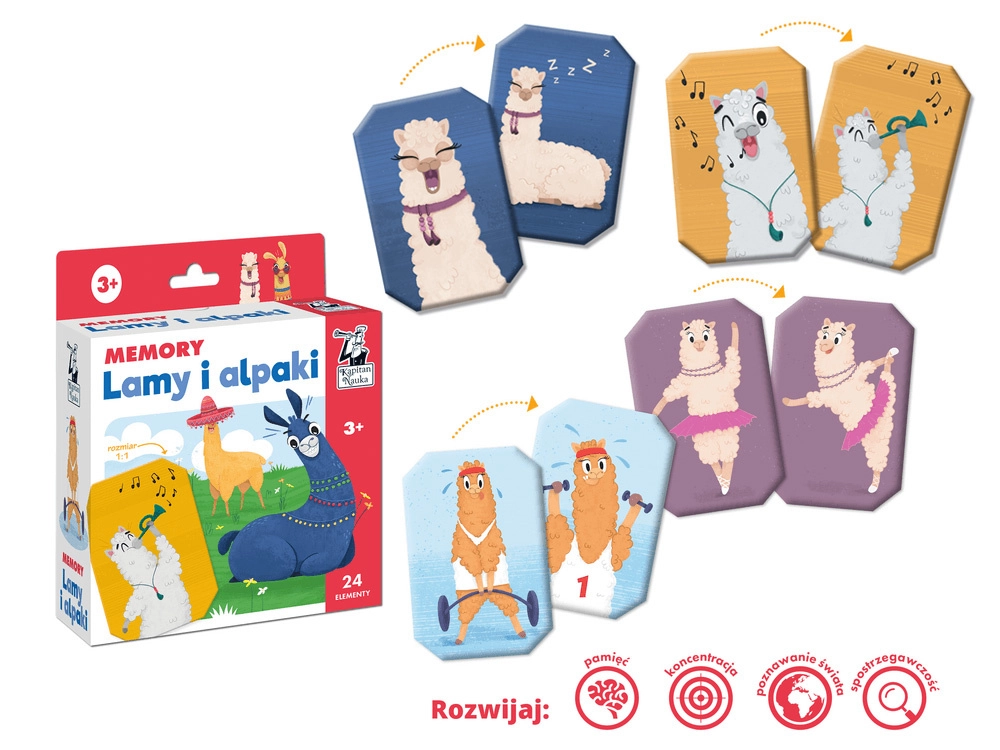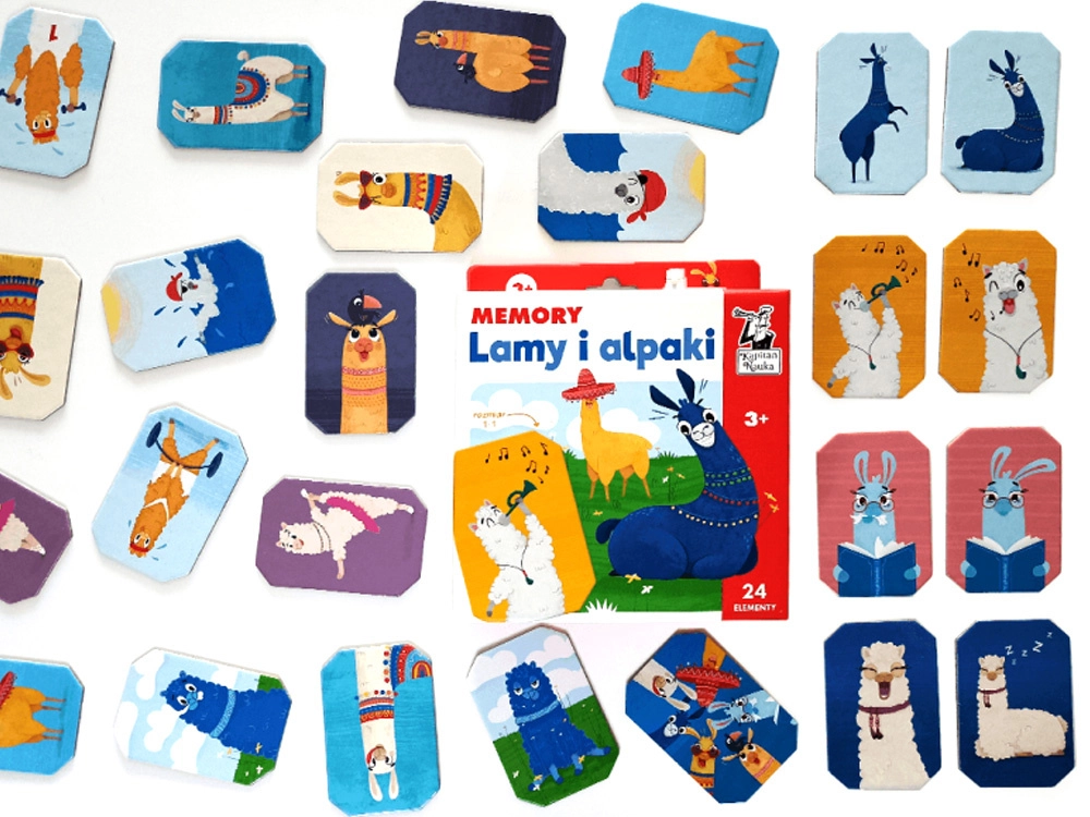 Un joc de memorie distractiv cu motive de lame și alpaca prietenoase pentru copii de la 3 ani. Jocul dezvoltă memoria, atenția și concentrarea în căutarea perechilor. Pachetul conține 24 de cărți (12 perechi) cu dimensiunea de aproximativ 9 × 6 cm, cu ilustrații vesele – balerină, muzicant, pirat și altele.