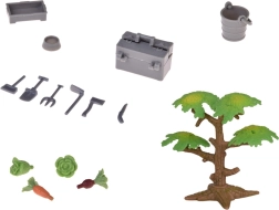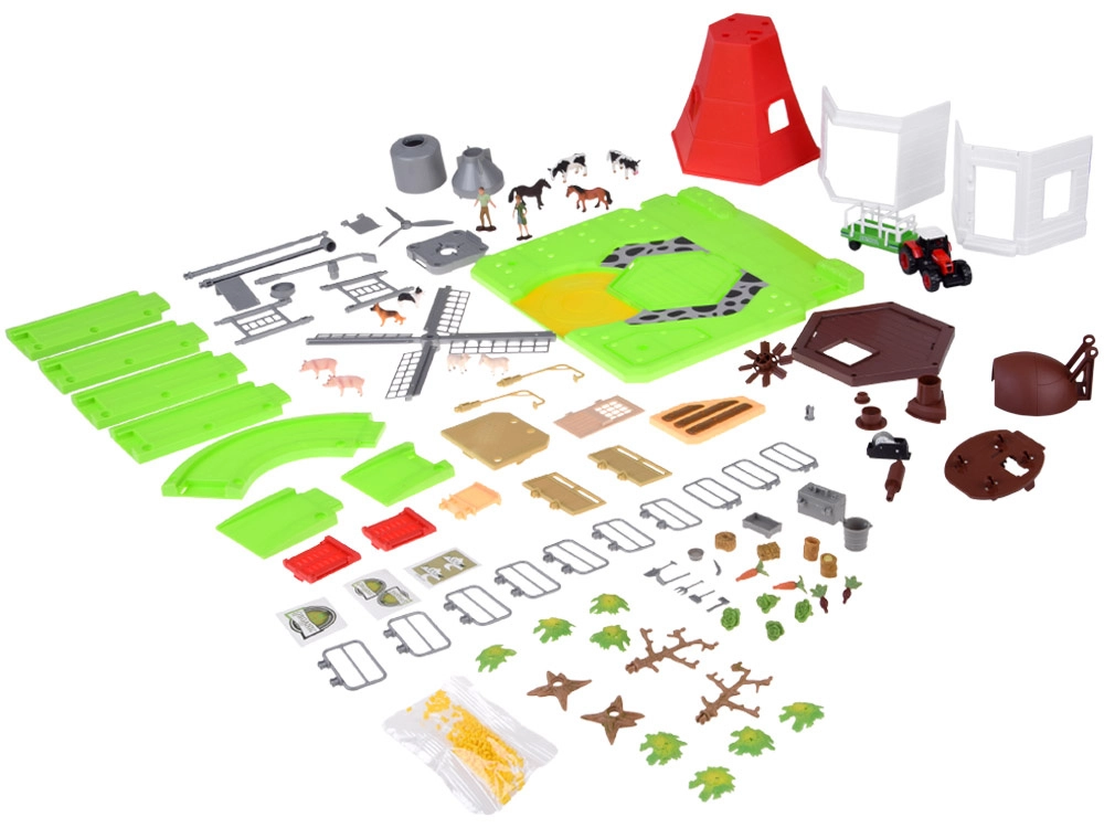 Pachetul include un tractor cu remorcă, figurinele de fermier și fermieră și un set bogat de animale de fermă (cai, vaci, porci, oi, câini). Nu lipsesc uneltele, găleata, lădițele, furajele și alte accesorii pentru scenete realiste. Piesele sunt colorate, modulare și ușor de asamblat, susținând astfel creativitatea, imaginația și organizarea spațiului.