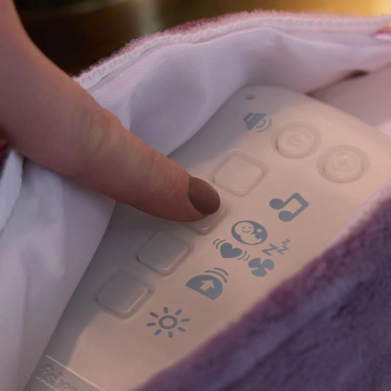 Burtica ce strălucește ușor și selecția de melodii, sunete din natură și zgomot alb ajută copilul să se liniștească și să adoarmă mai ușor.