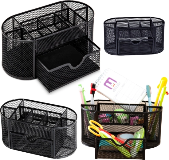 Compartimentarea practică oferă 6 compartimente, inclusiv un sertar glisant mic pentru mărunțișuri. Organizatorul este stabil, durabil și pregătit pentru utilizare zilnică intensă. Datorită dimensiunilor compacte, economisește spațiu, dar oferă suficient loc pentru rechizite de scris, caiete, agrafe și alte obiecte esențiale.