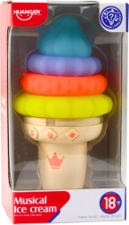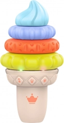 Această înghețată muzicală educativă este o alegere grozavă pentru primele descoperiri ale lumii prin joc. Piesele colorate, moi și elastice, cu texturi variate, invită la prindere, apăsare și stivuire în orice ordine, susținând gândirea logică și dezvoltarea motricității fine. LED-urile integrate și melodiile plăcute captează atenția copilului și stimulează simțurile.