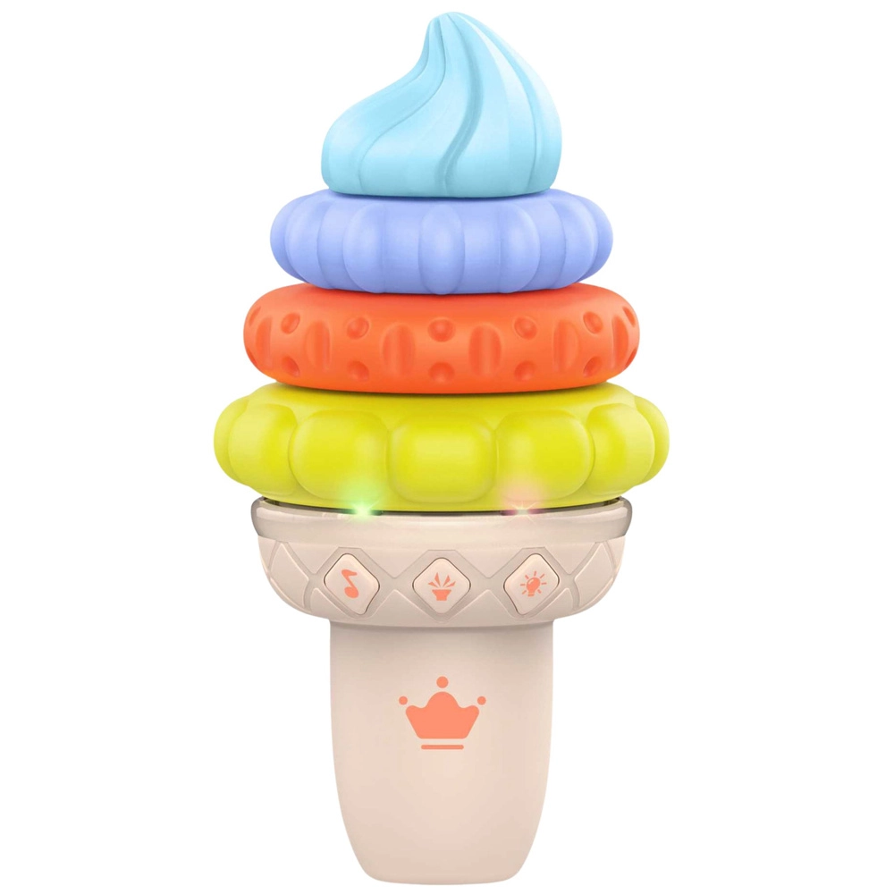 Înghețată interactivă adorabilă pentru cei mici, care le dezvoltă simțurile prin joc. Oferă efecte luminoase colorate, melodii și sunete, elemente moi cu texturi pentru apăsare și stivuire și sprijină motricitatea fină, coordonarea mână–ochi și învățarea culorilor. Construcție sigură, cu margini rotunjite și control ușor prin 4 butoane interactive.