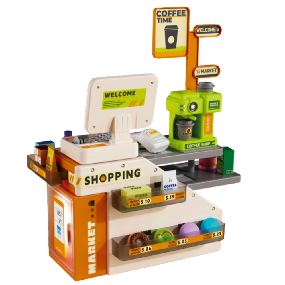 Casă de marcat colorată pentru copii, cu cafenea integrată, oferă un post complet pentru micul vânzător. Include scanner funcțional, espressor mare pe apă, tejghea și frigider care se deschid, precum și accesorii bogate. Efectele luminoase și sonore realiste stimulează imaginația, dezvoltă calculul, abilitățile de coordonare și jocul de rol.