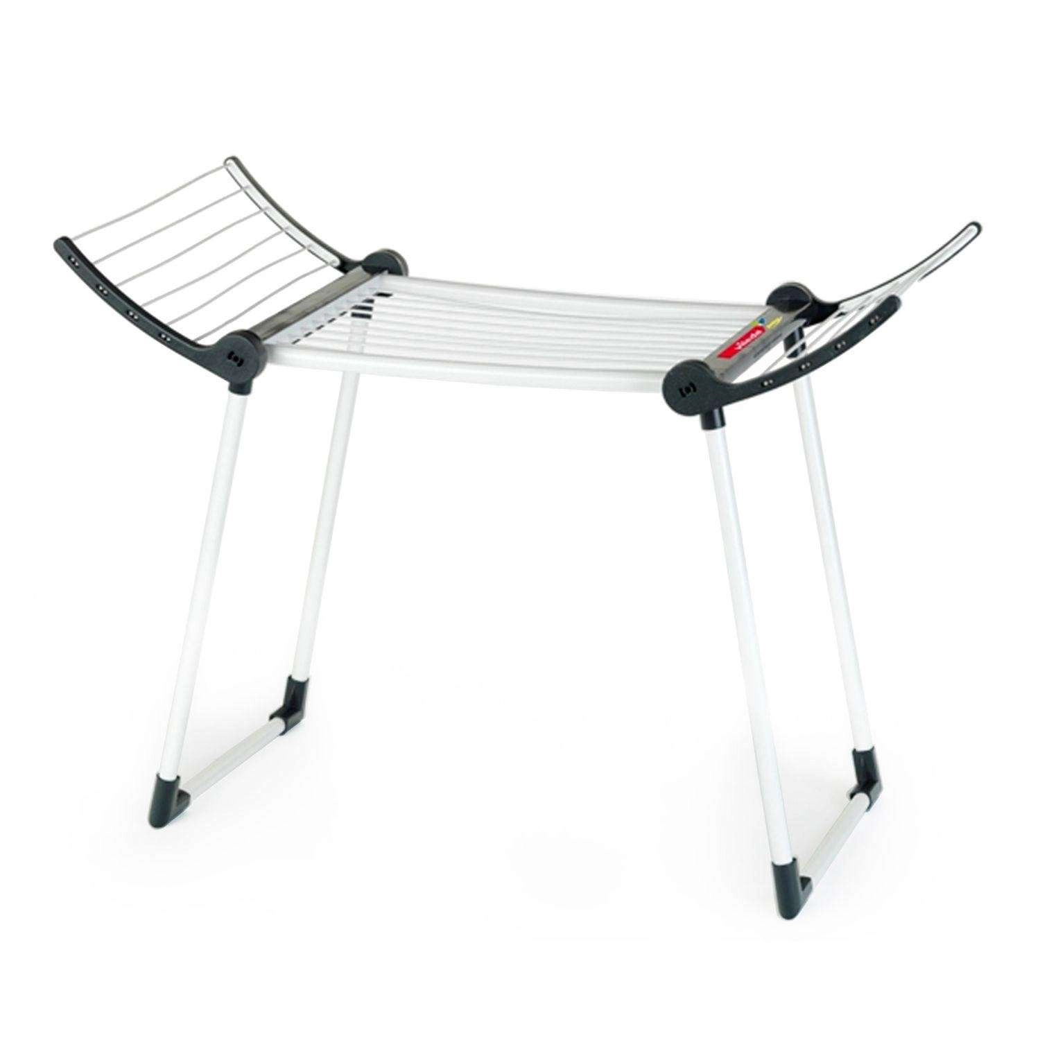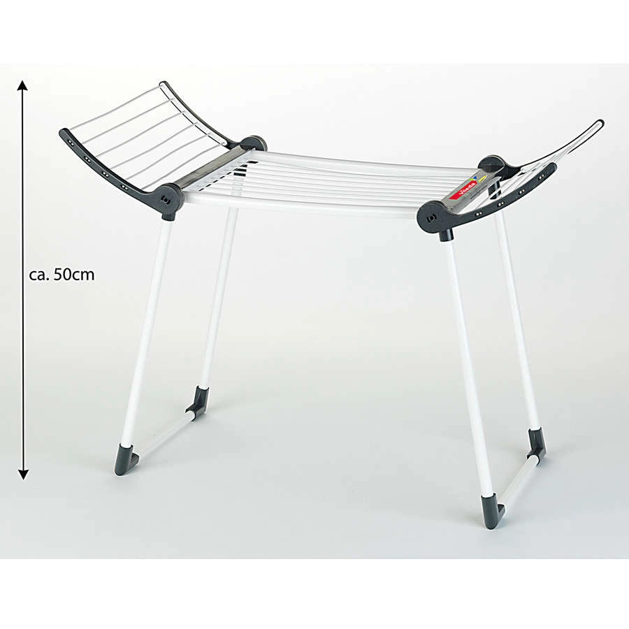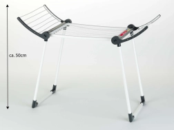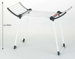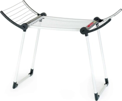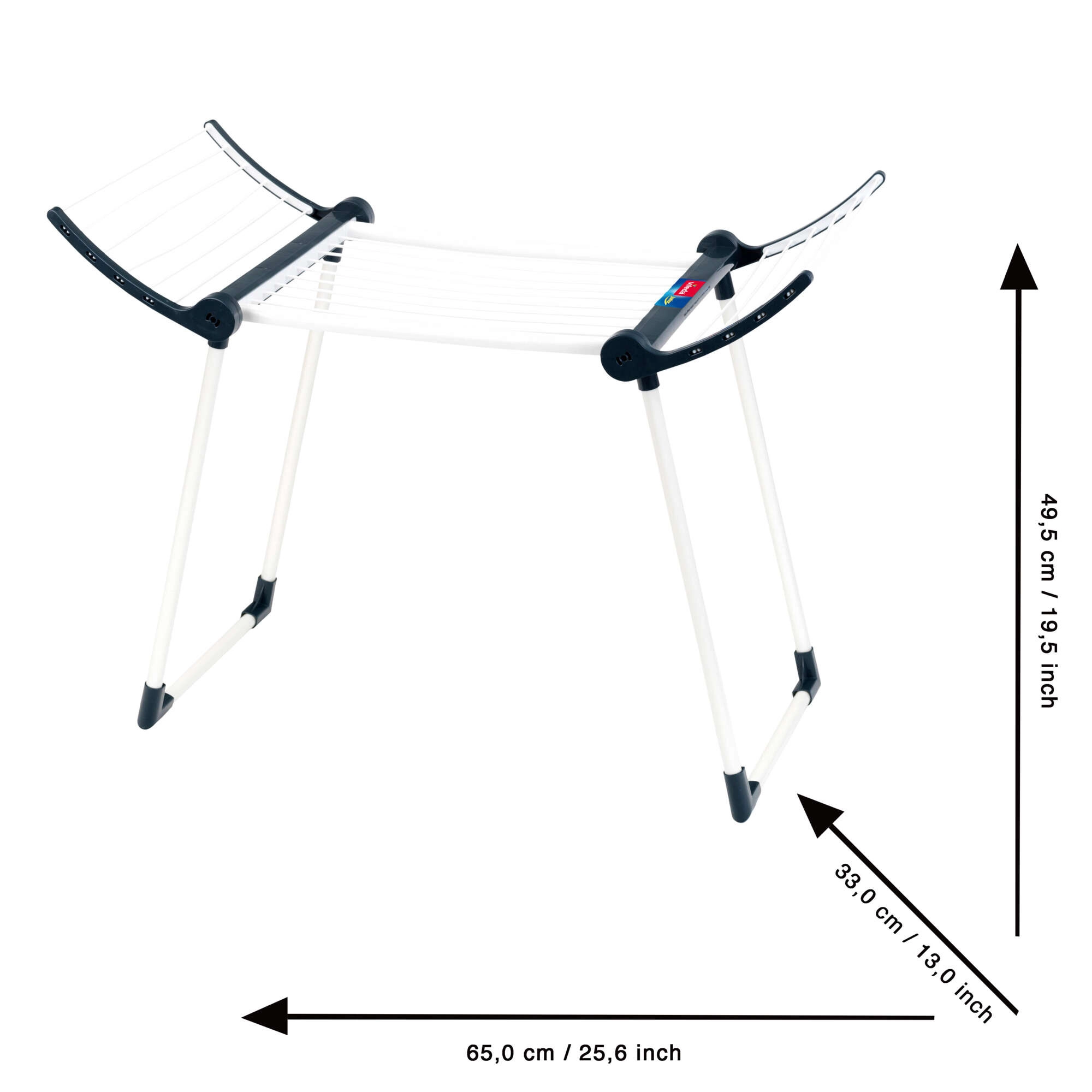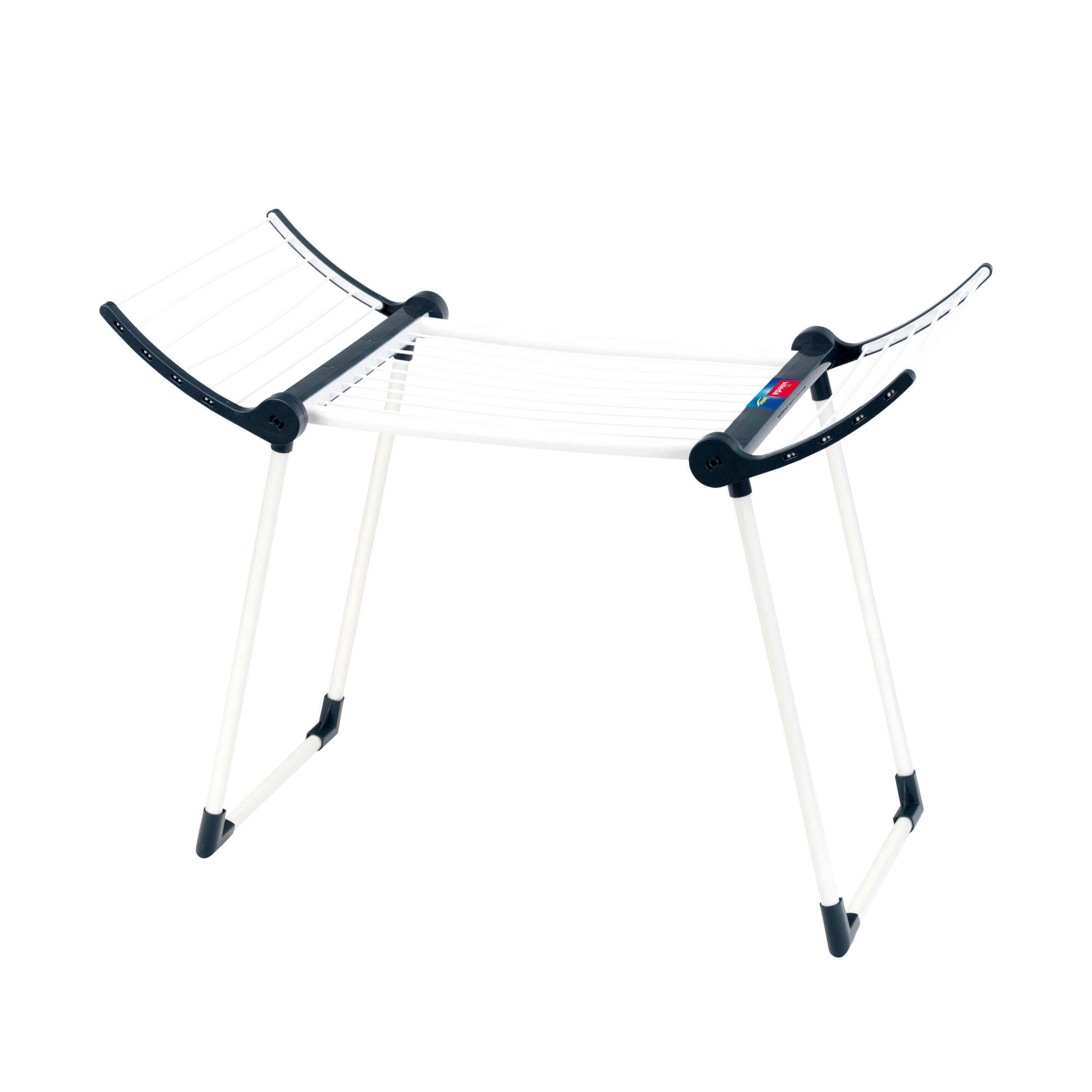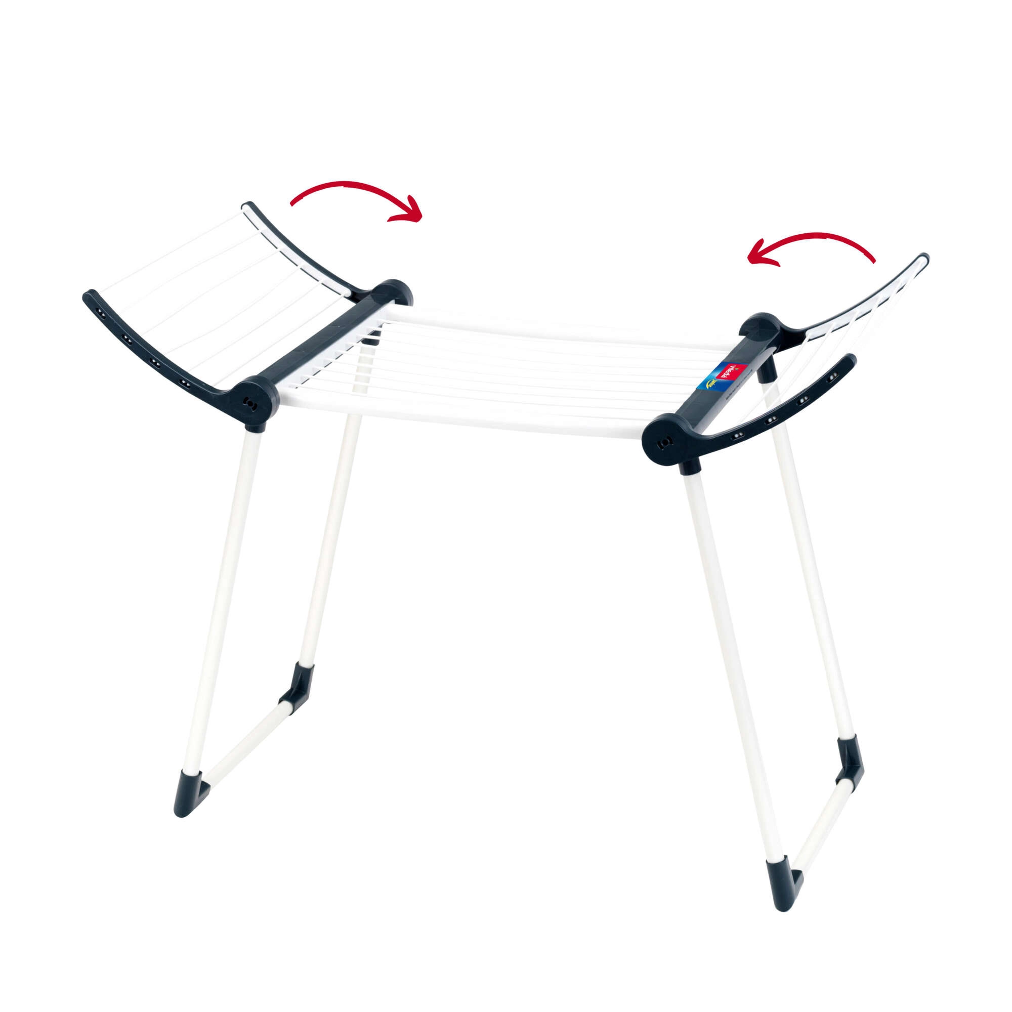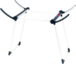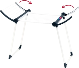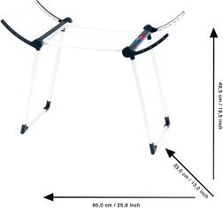 Construcția este solidă și stabilă datorită picioarelor duble; uscătorul este alb cu elemente negre și are două laterale rabatabile pentru mai multă suprafață de uscare. După joacă, îl puteți plia ușor la dimensiuni compacte, economisind spațiu în camera copilului.