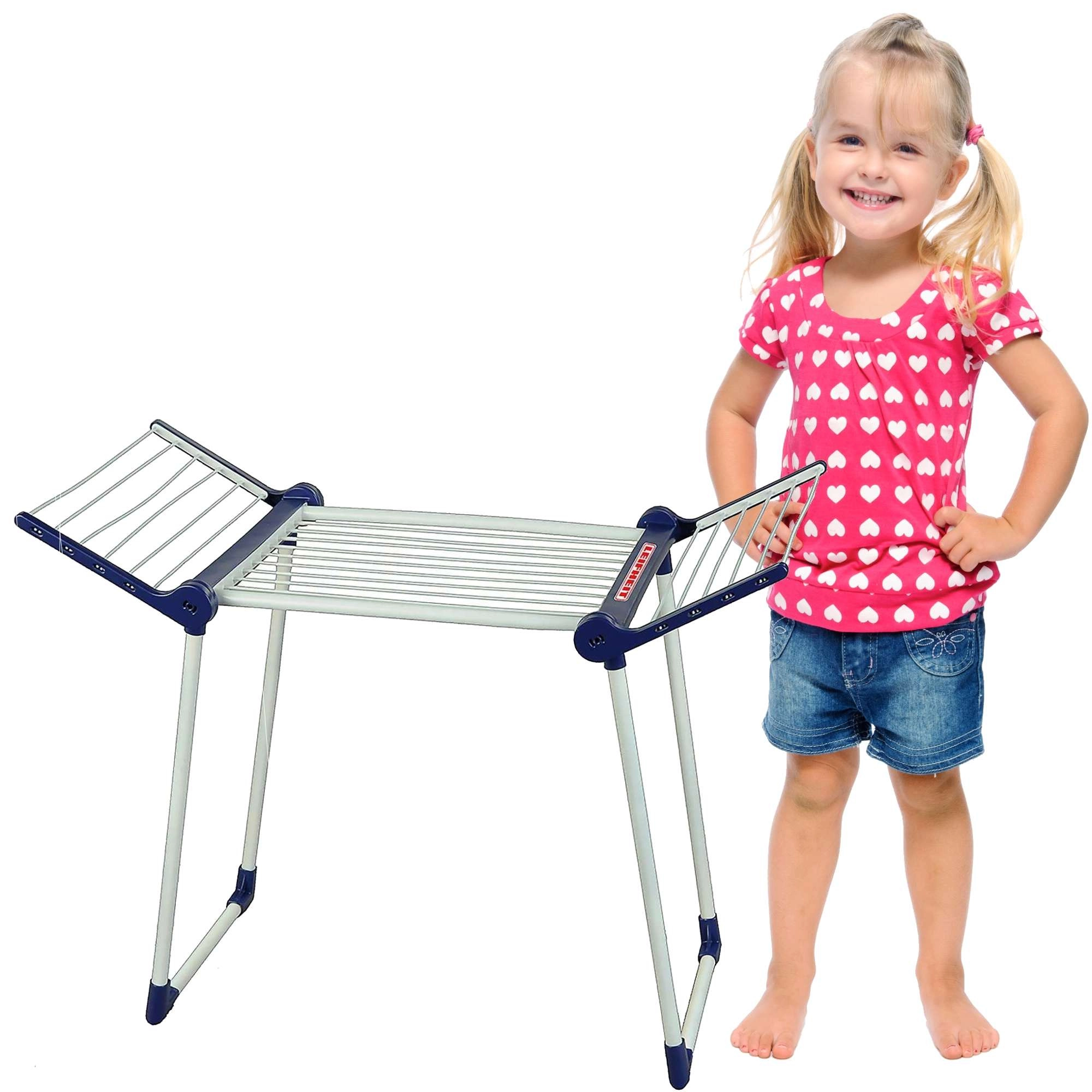 Acest uscător pentru copii este o copie fidelă a unui uscător real LEIFHEIT, oferind astfel copiilor un joc realist de gospodărie în condiții complet sigure. Datorită designului pliabil, se depozitează ușor și nu ocupă loc atunci când copilul nu se joacă.