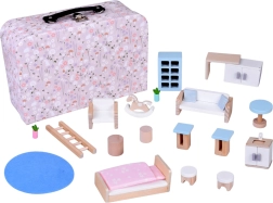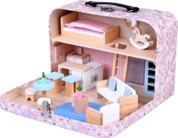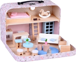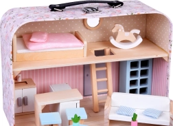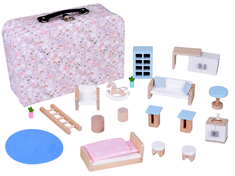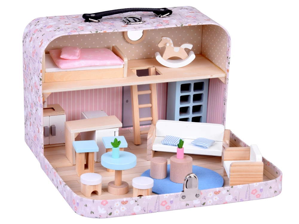 Drăguța căsuță de păpuși pe două niveluri, ascunsă într-o valiză cu model floral, îmbină joaca și depozitarea practică. Valiza care se deschide servește ca o căsuță de joacă și totodată ca o cutie de depozitare. Include mult mobilier din lemn în nuanțe pastelate delicate – pat cu pilotă, canapea, fotoliu, masă, măsuțe, dulăpioare, rafturi, scăunele, covoraș și căluț pe băț. Datorită mânerului, setul este ușor de transportat, compact și ideal pentru joacă creativă și dezvoltarea imaginației acasă și în călătorii.