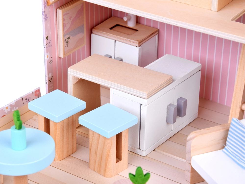 Deschideți valiza cu flori și pășiți într-o căsuță primitoare pe două niveluri. Sus se află dormitorul cu pat și pilotă, oglindă și un căluț retro pe balansoar, iar jos un living cu colț de bucătărie – ideal pentru ceaiul de la ora cinci, gătit împreună și relaxare. Toate piesele sunt din lemn neted, cu finisaj durabil, concepute pentru mâinile mici ale copiilor.