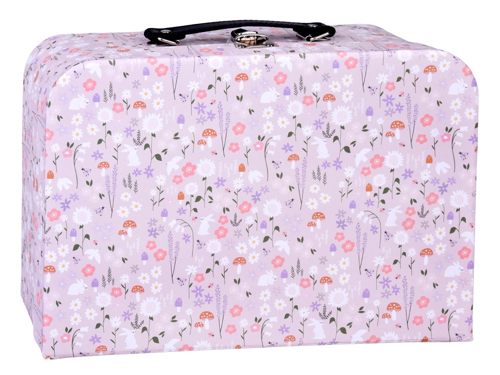 Valiza compactă cu imprimeu floral devine, după deschidere, o căsuță pe două niveluri. Servește atât ca jucărie, cât și ca spațiu practic de depozitare, totul este mereu la un loc și gata de plecare.