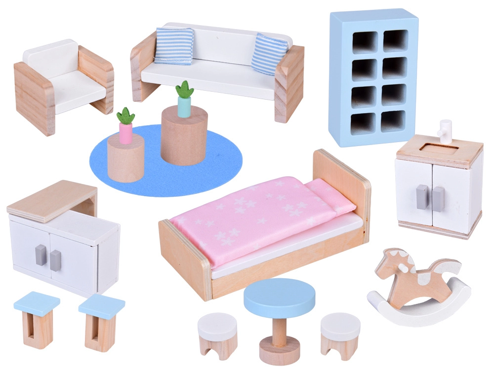 Pat cu pilotă, canapea, fotoliu, măsuțe, scăunele, blat de bucătărie, dulăpioare, rafturi, scară, covoraș, căluț și plante – toate în culori pastelate delicate pentru aranjamente creative.