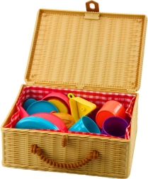 Adorabilul set de ceai pentru copii, într-un coș portabil, oferă până la 23 de piese colorate pentru joacă creativă de picnic, cafenea sau ceai de după-amiază. Material ușor și sigur, cu margini rotunjite și depozitare practică în coș împletit cu capac și mâner, pentru transport și stocare comode. Susține imaginația, colaborarea și învățarea culorilor.