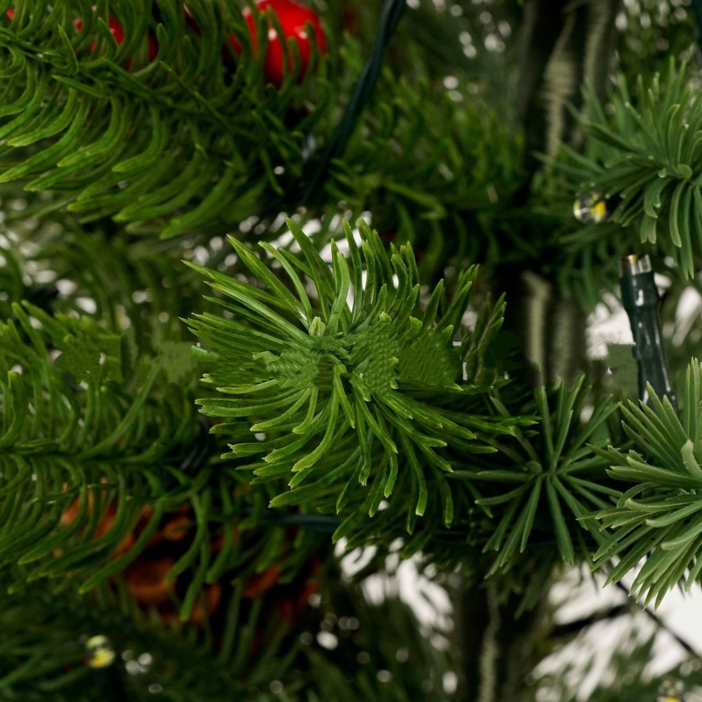 Șirurile luminoase LED integrate cu 3 moduri de iluminare oferă o lumină caldă și blândă. Structura ramurilor flexibile permite modelarea ușoară, în timp ce decorul cu bobițe roșii și conuri adaugă un aspect natural și clasic. Baza greutată îmbrăcată în iută menține bradul stabil și evidențiază stilul rustic.