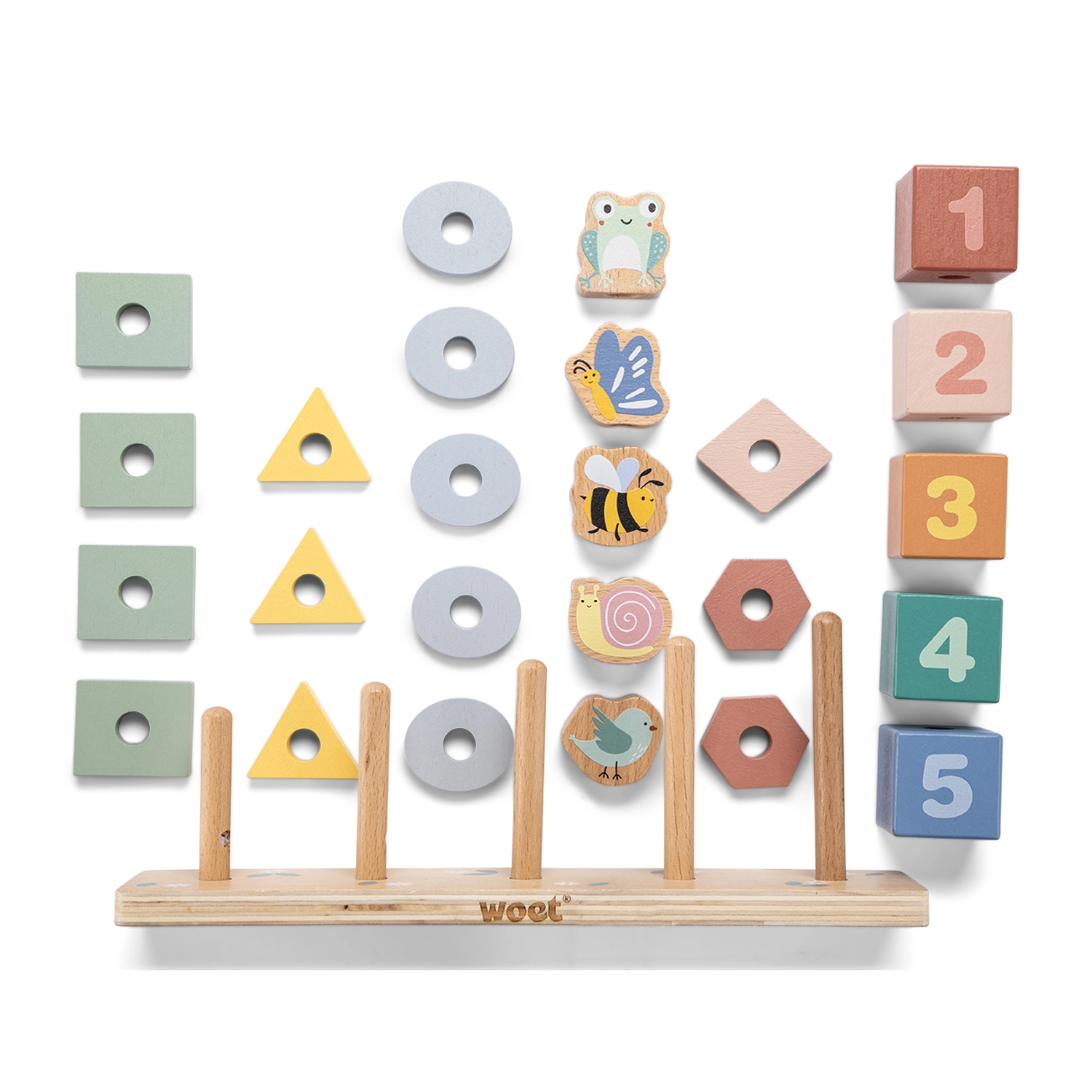 Descoperă numerele, culorile și formele cu această jucărie Montessori din lemn, care combină stivuirea, sortarea și primele exerciții de numărat. Datorită celor cinci stâlpi, blocurilor numerotate, inelelor colorate și animăluțelor drăguțe, dezvoltă motricitatea fină, coordonarea mână–ochi, gândirea logică și recunoașterea culorilor și formelor.