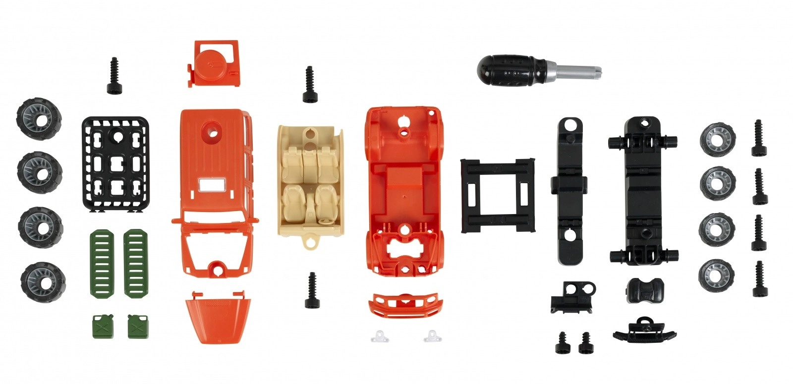 Cu sistemul de șuruburi și instrumentul inclus, copiii își asamblează singuri mașina, experimentează munca unui mic mecanic și înțeleg principiile de bază ale construcției.