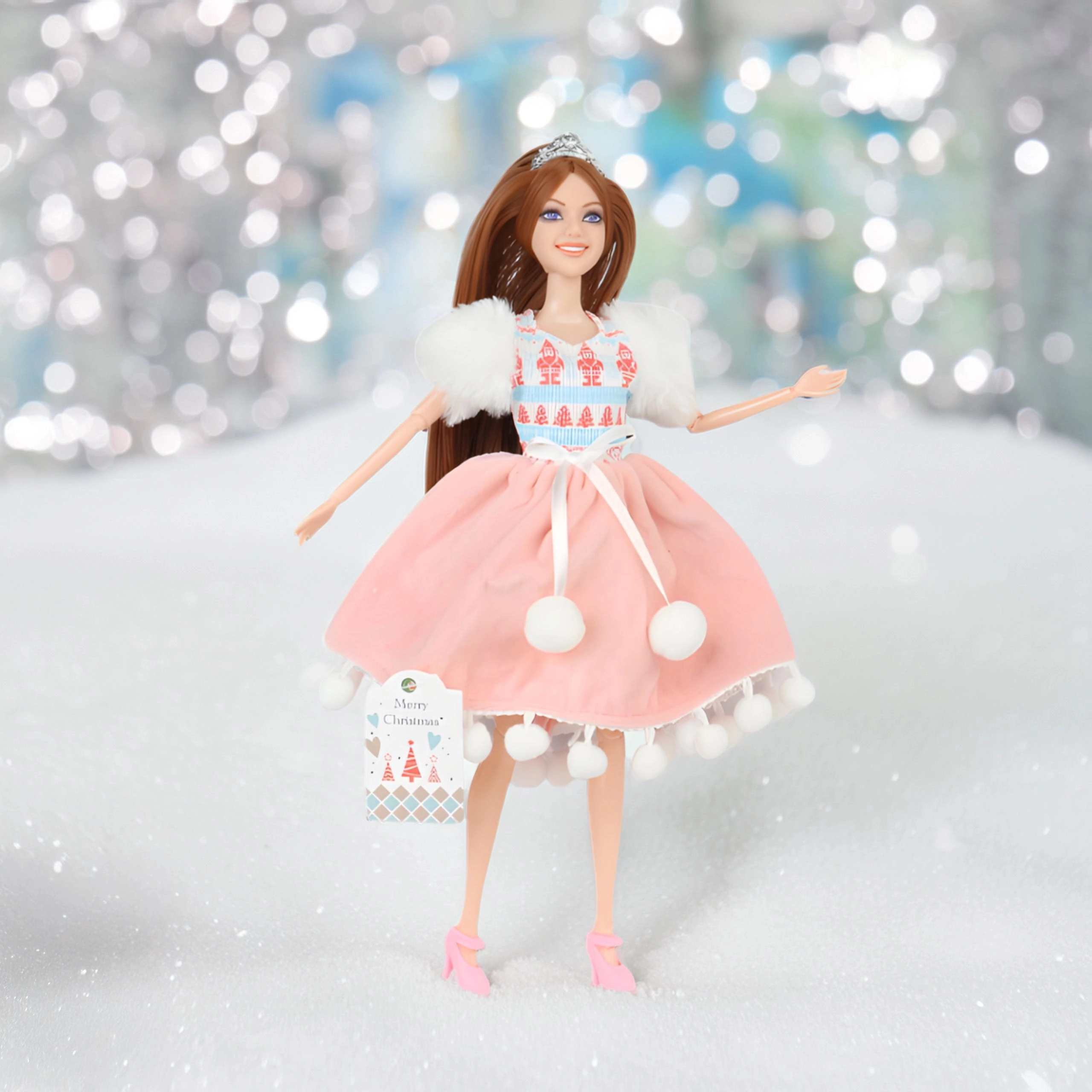 - Păpușă de iarnă stilată cu păr lung castaniu și coroniță