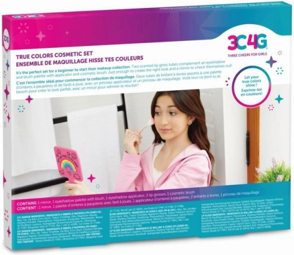 Setul cosmetic colorat True Colors de la 3C4G le oferă copiilor tot ce au nevoie pentru primul machiaj: oglindă, paletă de farduri pentru pleoape cu aplicator, 2 luciuri de buze și pensulă cosmetică. Ideal pentru începătoare de la 8 ani și ca un cadou grozav pentru micile cochete.