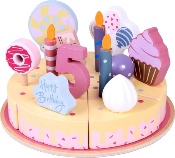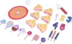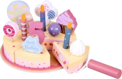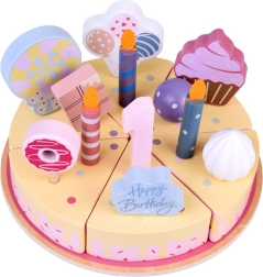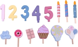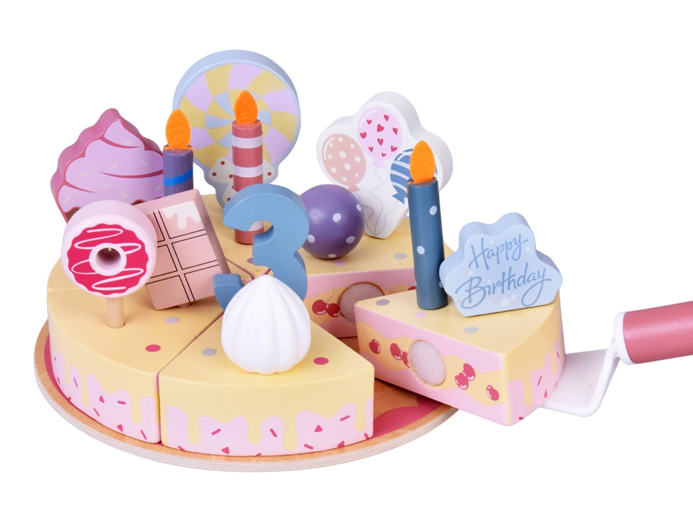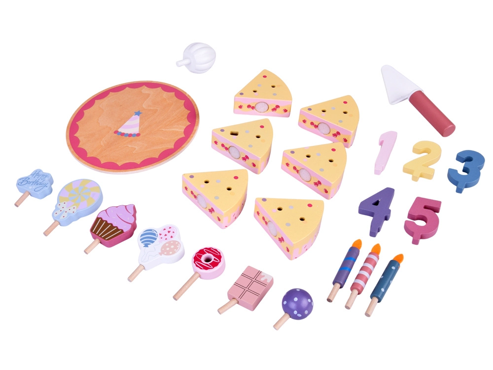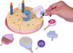 Construiți-vă propria petrecere de aniversare! Tortul din lemn este format din 6 felii care pot fi „tăiate” și reunite, apoi decorate cu lumânări, cifre și dulciuri interschimbabile. Setul este ideal pentru joacă împreună, învățarea culorilor, numărare și exersarea servirii politicoase.