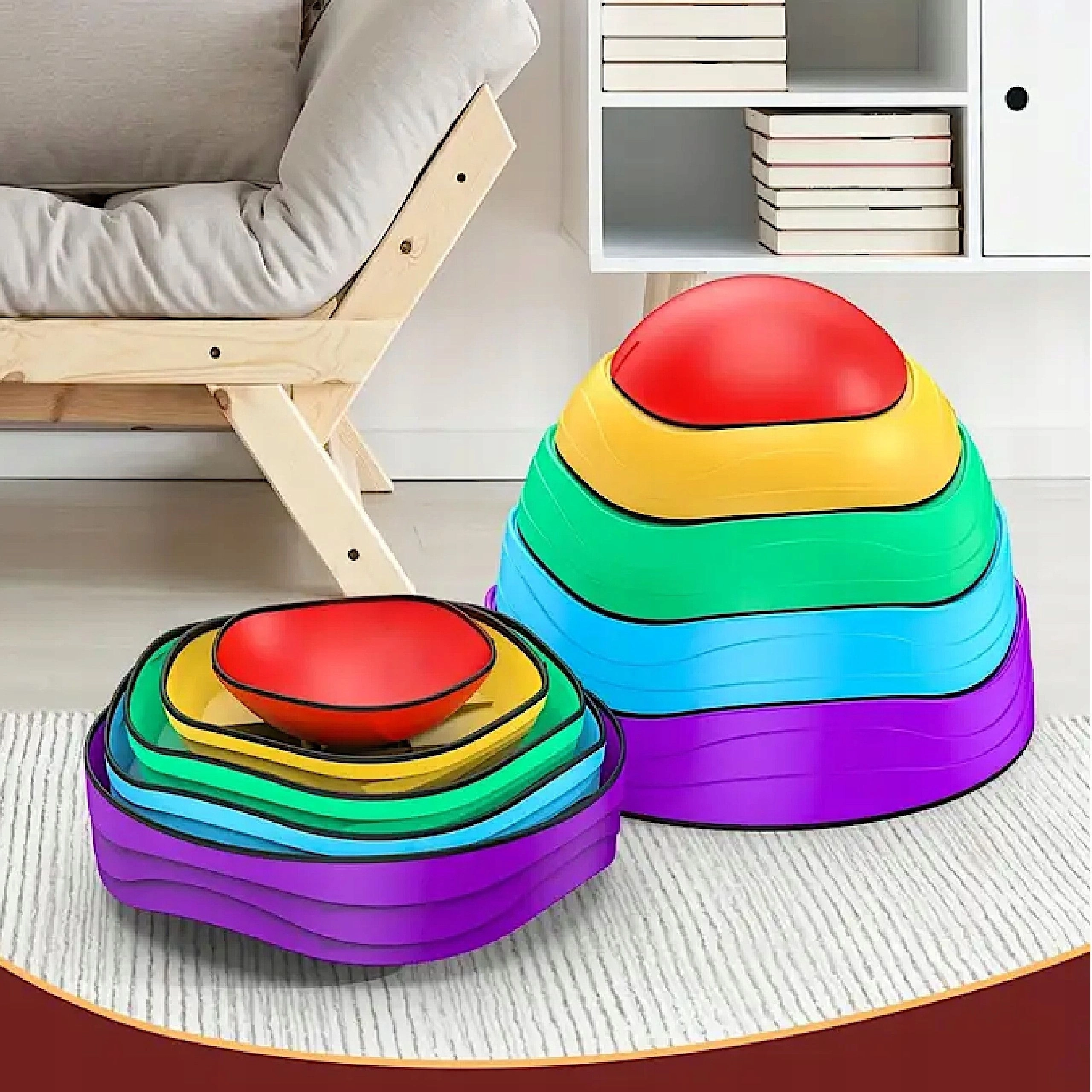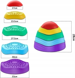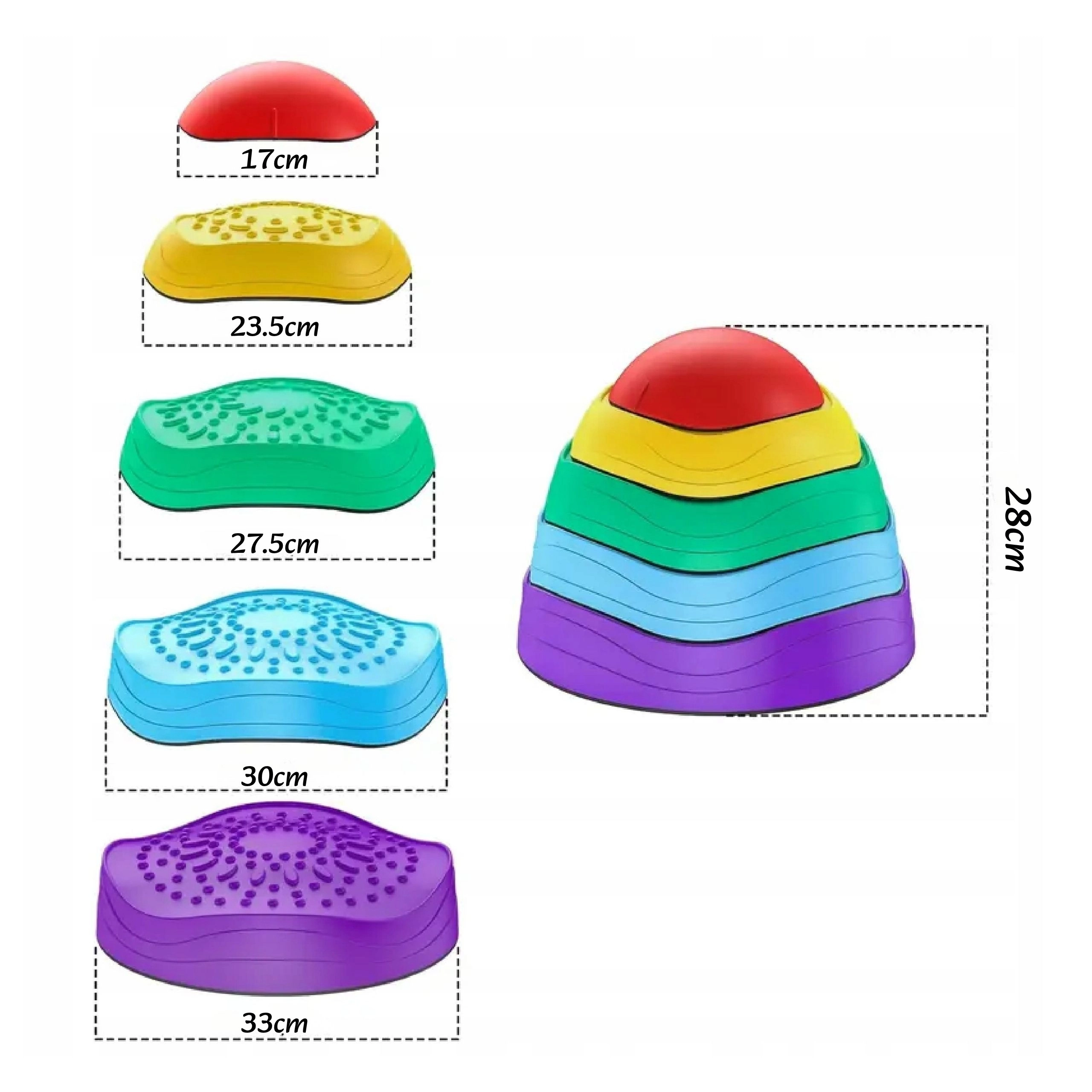 Datorită bazei antiderapante, pietrele rămân stabile în timpul jocului, iar suprafața texturată stimulează percepția senzorială a tălpilor și a palmelor. Designul stivuibil economisește spațiu la depozitare, iar culorile vii invită în mod natural la mișcare.
