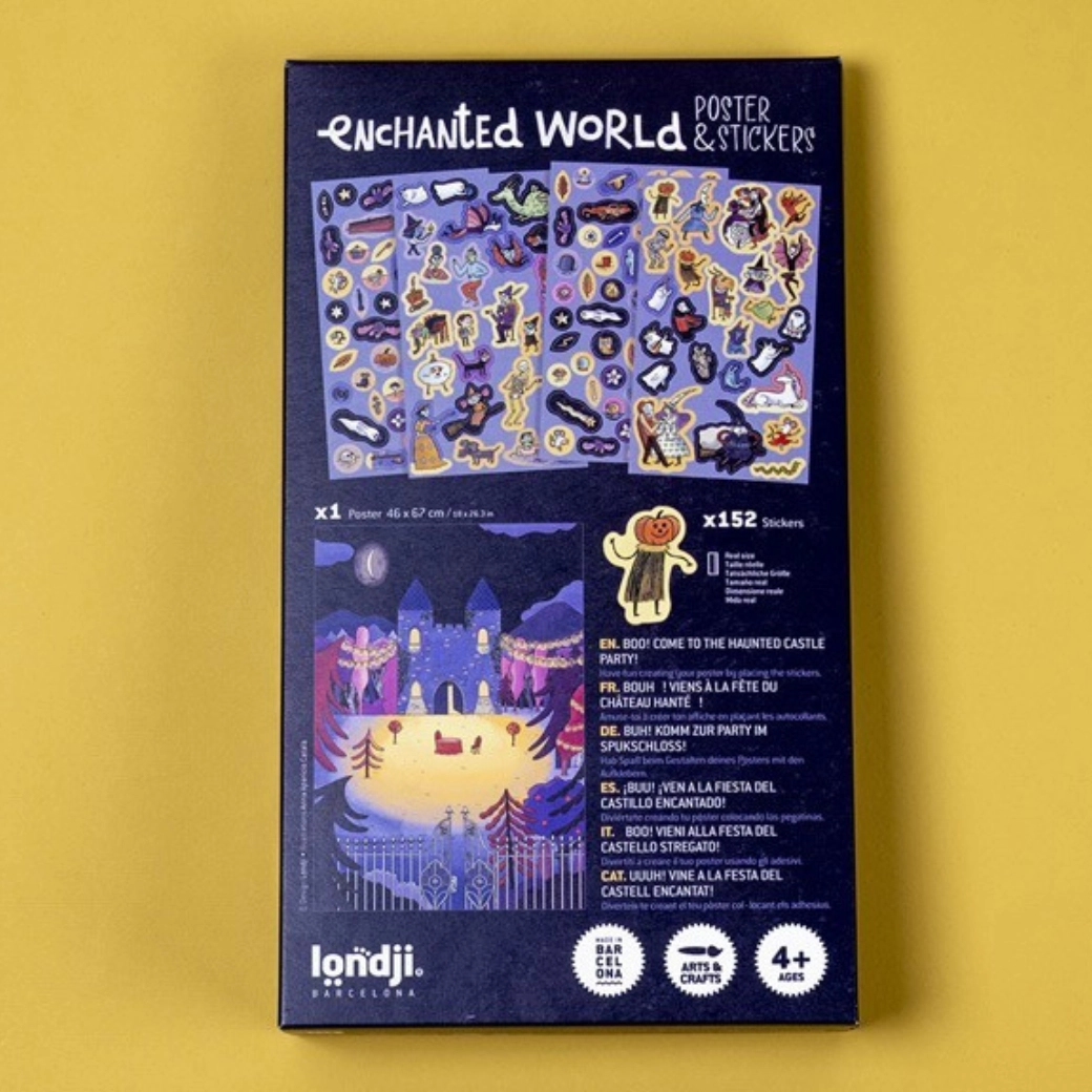 În ferestre se aprind luminile, umbrele dansează și din adâncurile castelului răsună o muzică misterioasă… Cu acest set creativ, copiii dau viață castelului bântuit după propria imaginație. Posterul de mari dimensiuni servește drept decor, pe care îl completezi cu zeci de autocolante tematice – fantome, ferestre, lilieci, personaje și colțuri secrete.