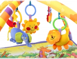 Jucăriile zornăie și piuie, sprijinind dezvoltarea auzului, tactilului și a motricității fine și grosiere. Datorită inelelor ce se deschid, le detașați cu ușurință, iar copilul își poate lua prietenii preferați cu el. Salteaua este compactă, se montează și se strânge rapid, iar datorită genții de plastic pentru transport o puteți lua oriunde.