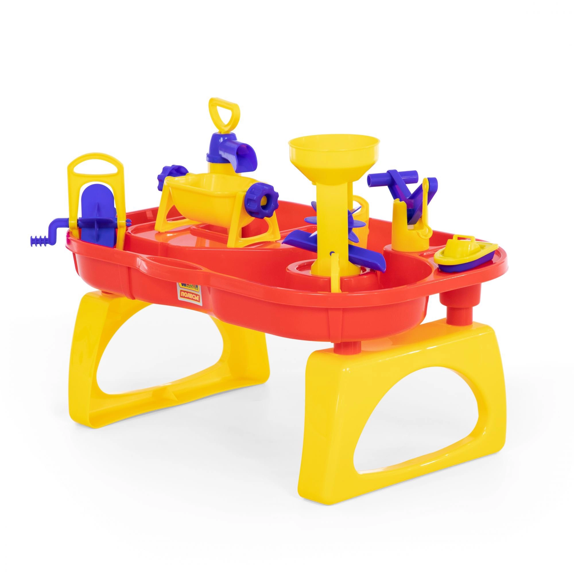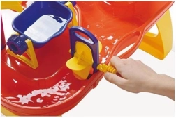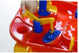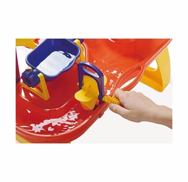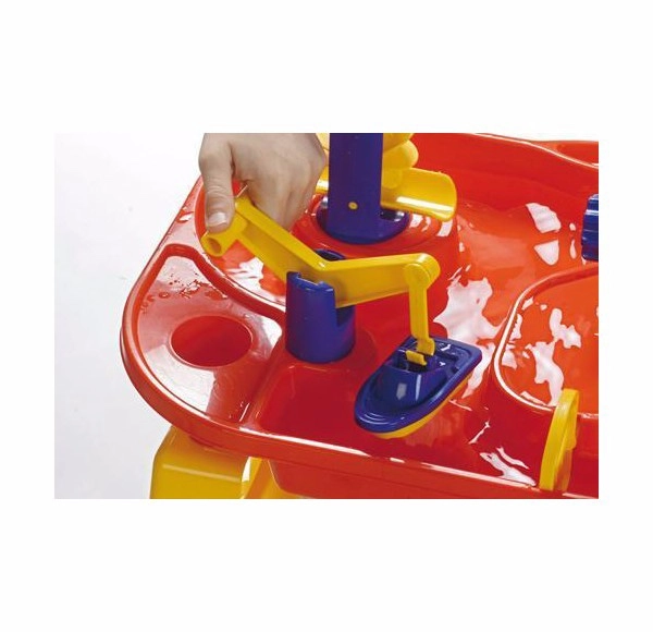 Acest colorat masă de joacă cu apă este un sistem de canale bine gândit, cu elemente interactive, care oferă copiilor ore de joacă senzorială și creativă. Datorită pompei manuale, morii de apă și morii manuale precum și macaralei, copiii pot urmări cum curge apa, cum învârte paletele și cum împinge bărcuța prin porți și curbe.