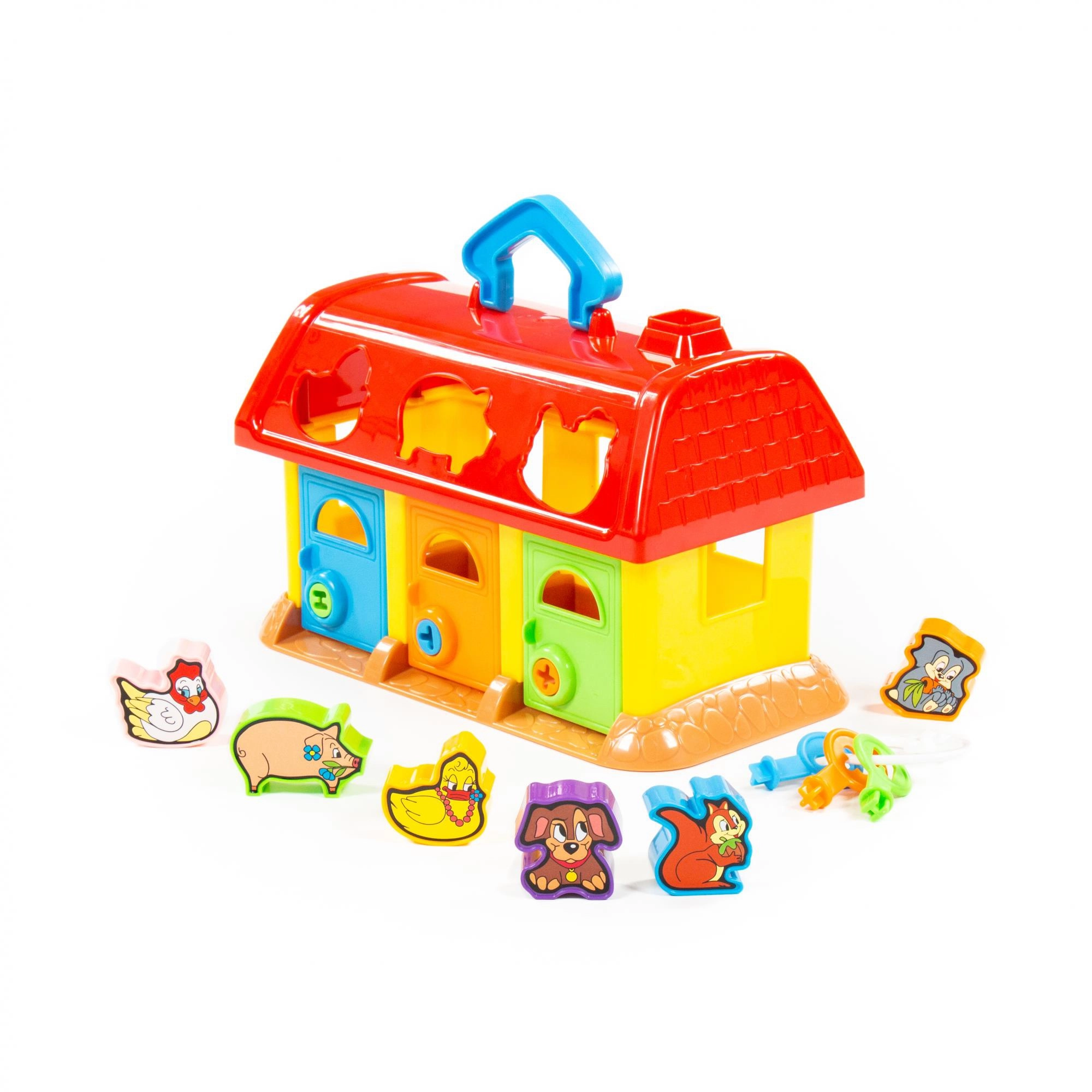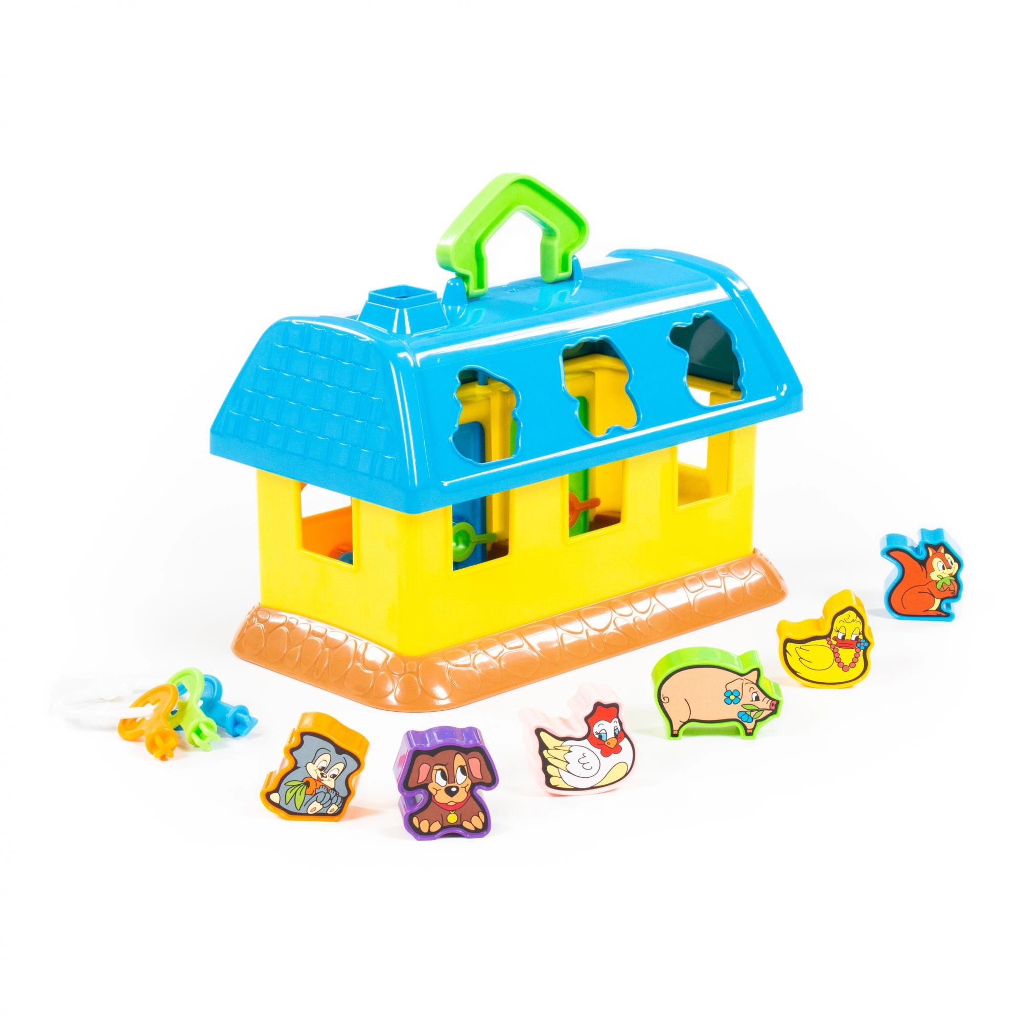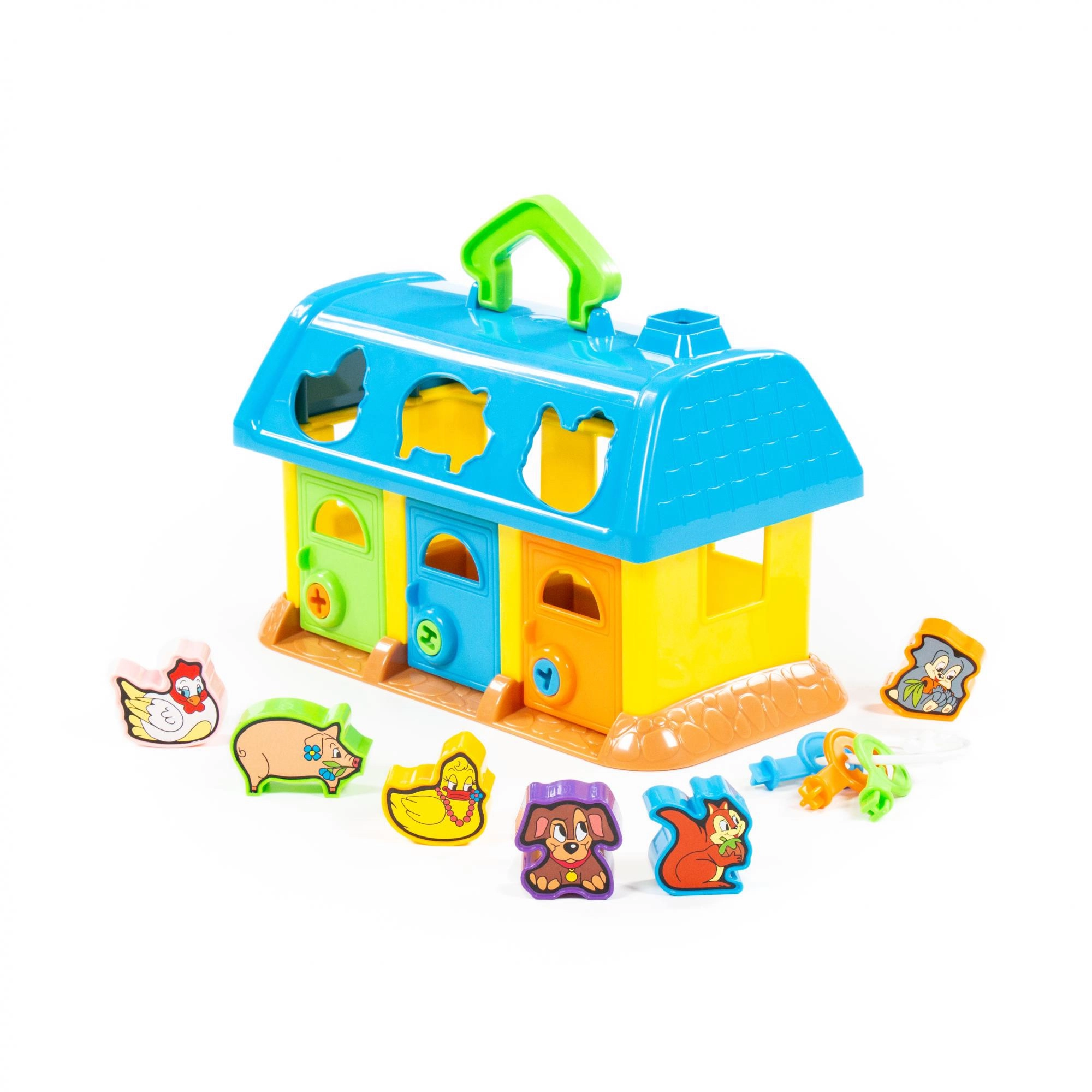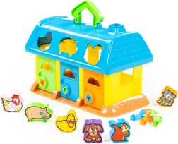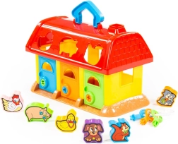 Această căsuță colorată din plastic este o alegere excelentă pentru primele jocuri didactice. Copiii introduc formele cu animăluțe în orificiile potrivite din acoperiș, iar cu ajutorul cheilor deschid ușițele pentru a-și recupera „comorile”. Jucăria sprijină în mod natural coordonarea mână–ochi, răbdarea și reprezentarea spațială.