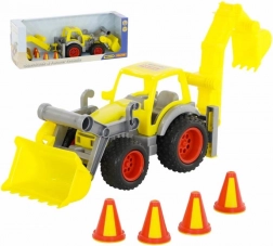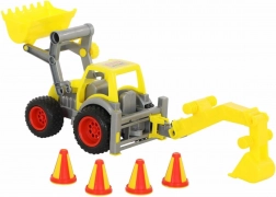Tractorul este echipat cu anvelope din cauciuc pentru o deplasare silențioasă și lină. Lopata și excavatorul se manevrează ușor și dezvoltă motricitatea fină, imaginația și coordonarea. În pachet găsiți de asemenea 4 conuri pentru delimitarea șantierului și inventarea propriilor scenarii de joc.