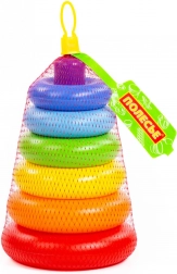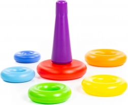 Șase inele în culori vibrante și un con central robust susțin percepția vizuală și stivuirea independentă.
